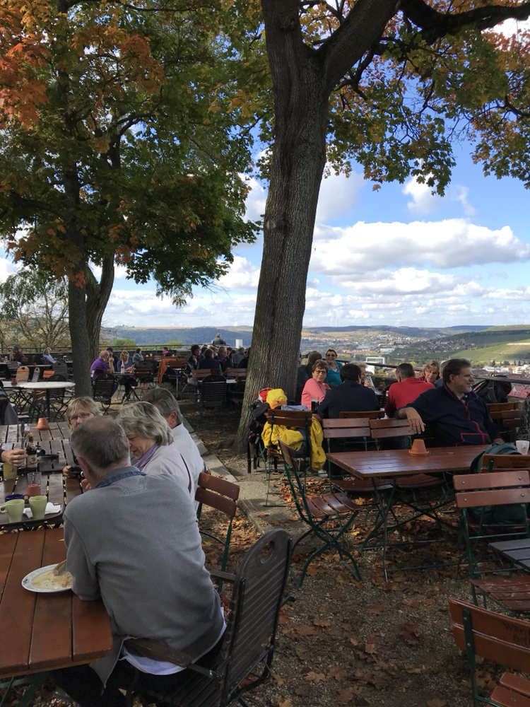 레스토랑의 야외 테이블이 있는 뒷마당으로 들어서니, 그냐말로 환상이다. 푸른 하늘은 그야말로 그림같았고 그 아래 도시의 전경과 가을의 단풍으로 형형색색으로 물든 테라스와 잘어울렸다. 잠시 머물러서 맥주나 한잔하고 싶었지만 한시간 뒤쯤 체크인을 했어야 해서 (에어비앤비의 가장 싫은점, 집주인과 체크인시간을 맞추고 변경하기 어렵다는 점) 아쉽지만 나와 아까 보아두었던 외곽을 따라 걸을 수 있는 입구로 향해 올라갔다.