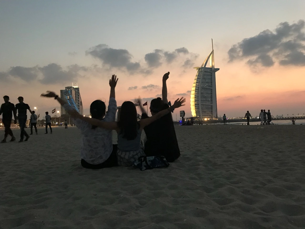 아침부터 명우빌딩이라고 놀린 버즈 알 아랍이 그제서야 이름값을 하는 순간이었다. 하늘은 분홍색을 여기저기 남겨둔채 어둑어둑 해지기 시작했다. 적당히 걸쳐져있는 구름은 짙은 코발트색을 내며 운치를 더해주고 있었고 그 가운데 조명빛을 받은 버즈 알 아랍이 우뚝 서 있었다. 눈앞에 풍경이 믿겨지지 않는다. 도착한 셋은 흩어져서 각자의 감성에 젖어 예술혼(?)을 뽐내며 이 순간을 사진과 영상으로 담아냈다. 한참을 그렇게 넋을 놓고 보다 우리의 시그니쳐 사진을 찍으려고 자리를 잡는다.