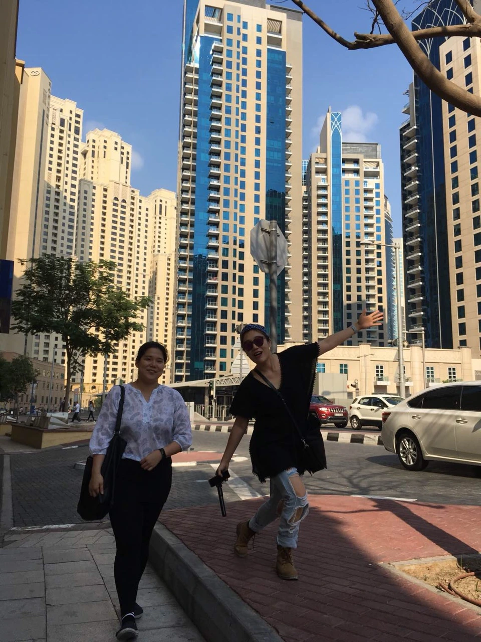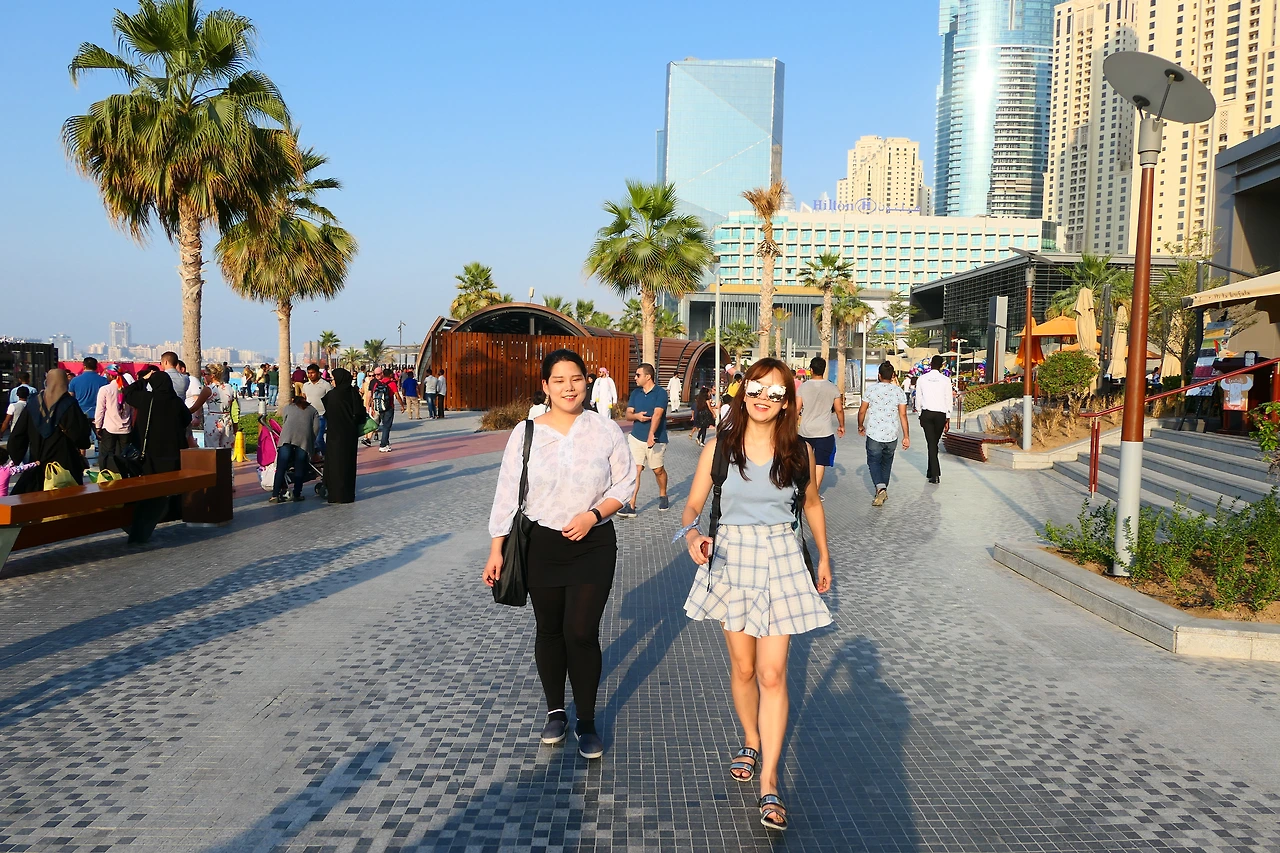 호텔 밖으로 나와 숙소 앞 왕복 12차선은 되어보이는 도로위의 실내육교(?)를 건너 트램역을 향해 걸었다. 하늘을 보고 감탄하고, 숨을 쉬며 감탄, ‘마치 공기에서 조차 꽃향기가 나는것 같아!!!’ 라고 호들갑을 떨며 깔깔대고 웃는다. ‘여기봐요, 도로도 하나같이 잘 닦여있어요!’ 깨끗한 숨을 쉬며 깨져있지 않은 도로위를 안전하게 걷는다는 것만으로도 기뻤다. 길 건너편에 아무렇지도 않게 보이는 버즈 알 아랍을 보며 우리 셋다 동시에 뭔지 모를 실망감을 느꼈다. 사진빨에 속은 기분이었다. 제시가 버즈 알 아랍이 아니라 마치 명우빌딩 같네요 라고 우리의 심정을 적절하게 표현했다. 사진이나 영상을 통해본 6성급의 화려한 호텔이미지가 아니라 두바이 어디서도 쉽게 보이는 친근한 느낌이었기 때문이었다.