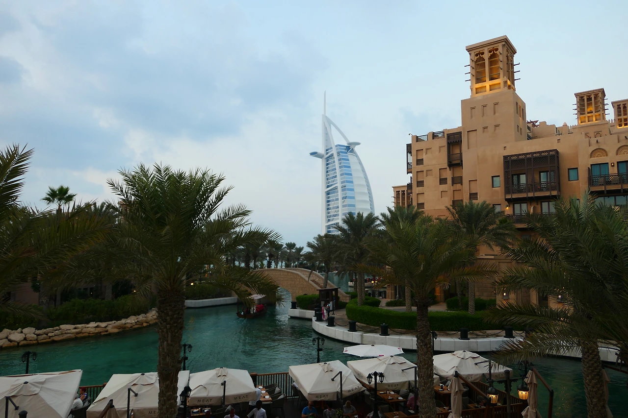택시를 타고 마디낫 주메이라로 이동하는 중간에도 점점 하늘이 아름답게 붉어지는데 초조해 발만 동동 구른다. 15분 쯤 걸려 도착해서, 전통시장을 그대로 재현한 시장길을 가로질러 하늘이 보이는 야외로 달려나갔다. 마디낫 시장을 구경하는 것도 여행 코스 중에 하나인데 눈길도 안주고 뛰다시피 걸어갔다. 시야가 틔인곳으로 빠져나오자 어디선가 봤던 풍경이 눈앞에 펼쳐진다. 인공으로 만들어놓은 물길를 가로지르는 다리 뒤로 버즈 알 아랍이 서있다.