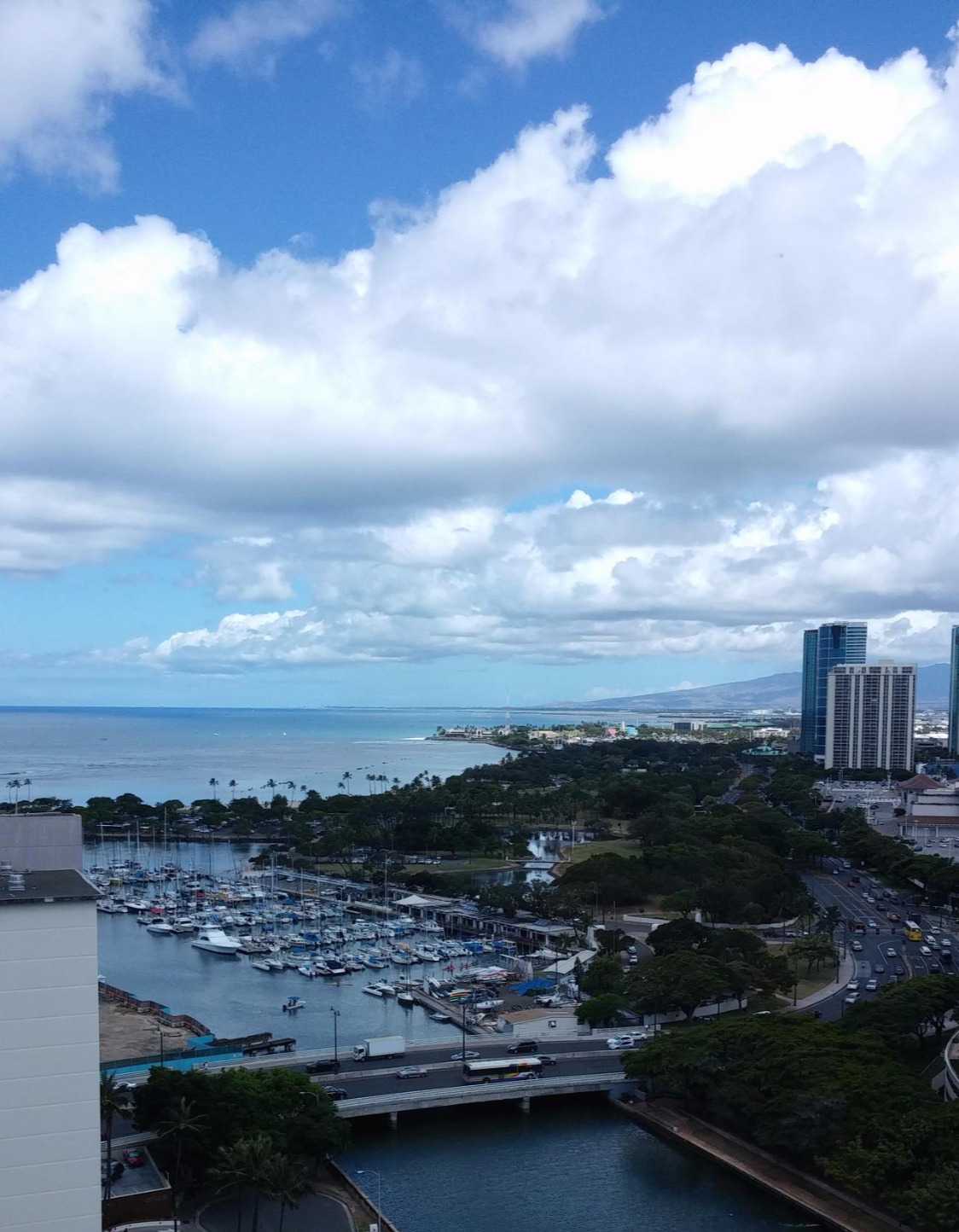 항상 창문 너머 알라모아나 비치가 보였다. 눈만 뜨면 보이는 곳인데도 아직 저기를 가보지 못했다니... 주차 때문에 노이로제에 걸린 나는 이번엔 차를 두고 자유롭게 걸어 다니고 싶었다. 구글맵으로 거리를 찾아보니 집에서 도보로 7분밖에 안 됐다. 오~예스! 그래, 오늘은 걸어서 가 보자. 아이들도 걷는 데는 일가견이 있으시니 수영복을 입으시고 그 위에 가벼운 옷을 하나 걸치고 걷기 시작했다.