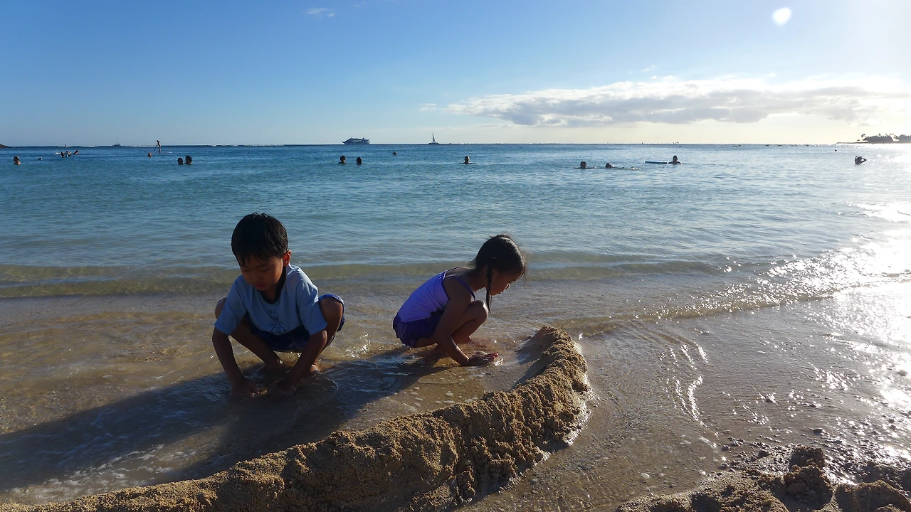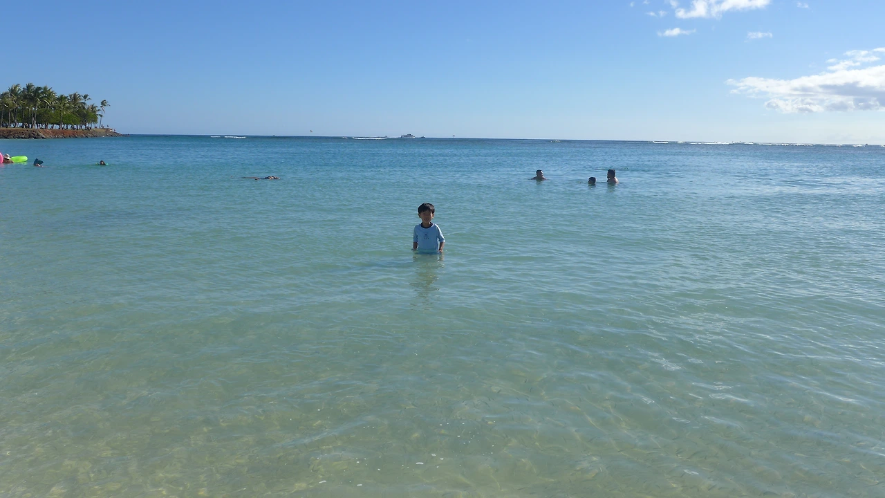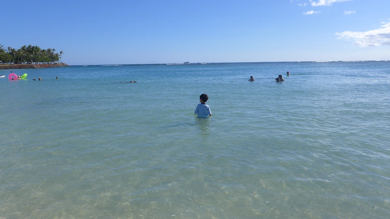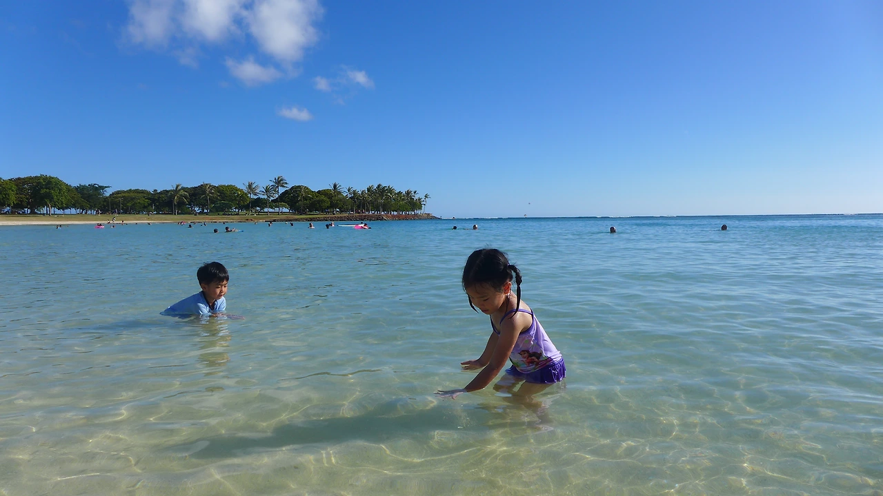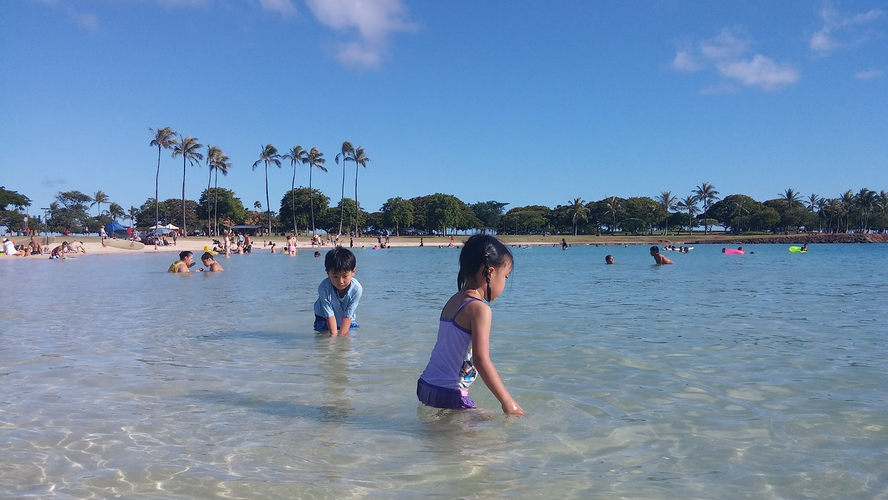 라는 말을 내가 했을까? 나는 독한 구석이 있는 엄마다. 이런 약한 소리가 목구멍에서 나오려고 하는데 꿀꺽 삼켜버렸다. 이것도 다 추억이 될 텐데 말이야, 우리가 언제 알라모아나 비치 파크를 걸어보겠냐. 엄마는 원래 자신의 실수에는 관대한 걸까? 속으로는 미안했지만 또 당연하게 겨우겨우 도착했다. 나는 양 손에 모래놀이 세트와 보냉 가방을 들었고, 물론 보냉 가방 안에는 얼음물 두 병과, 과자, 과일을 담았으니 무게가 좀 나갔다. 아이들은 각자 자기들 타고 놀 튜브와 스위밍 누들을 어깨에 끼고 뙤약볕을 걸어왔다. 그러니 물을 보는 순간 아이들은 마치 사막 한가운데서 오아시스를 만난 낙타처럼 뛰어 들어갈 수밖에...