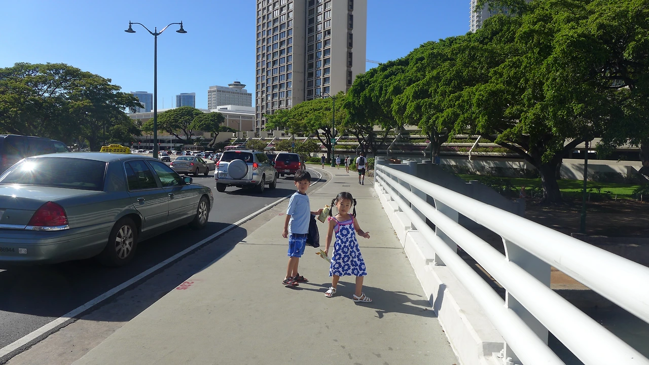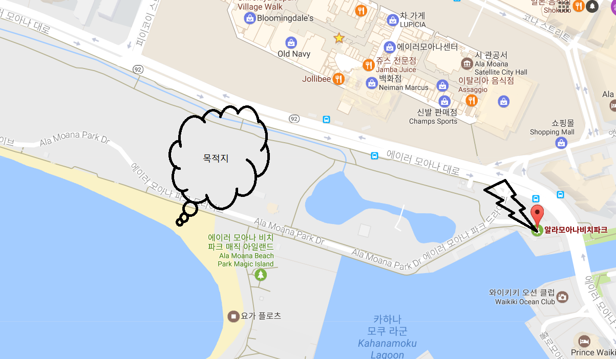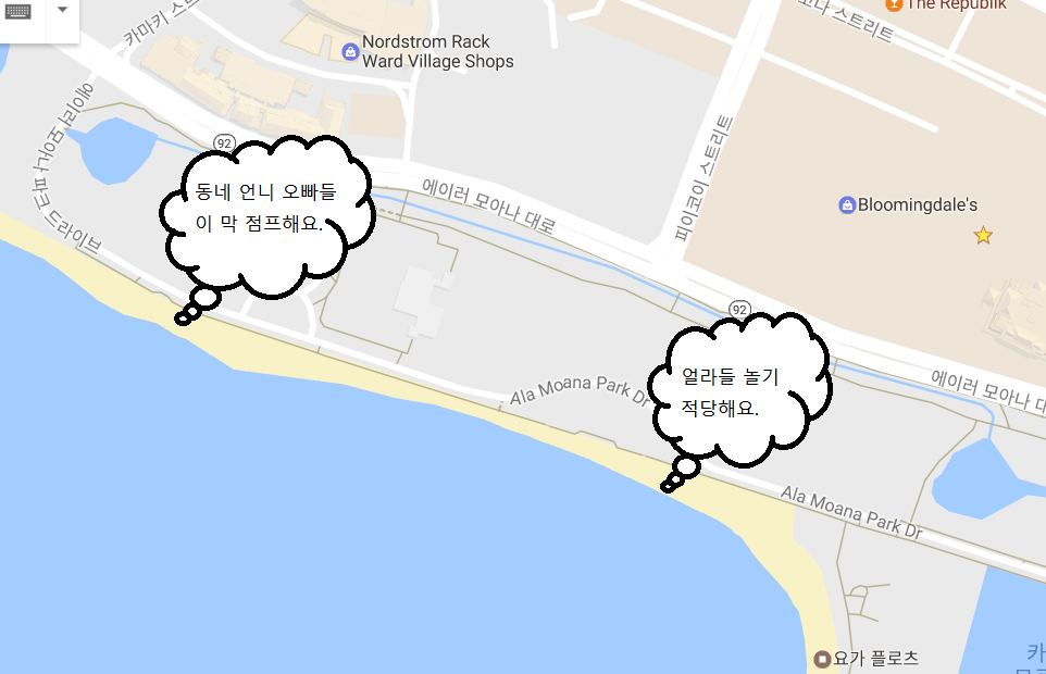 집 밖을 나오니 덥긴 덥다. 만날 자동차로 다니다가 보따리를 들고 걷기 시작한 지 5분. 급후회가 됐다. 7분은 어른들 걸음 기준인가. 아이들과 함께 걸으니 대충 20분은 걸린 것 같다. 아무리 생각해도 이상하여 다시 찾아보니 아뿔싸! 구글맵에서 말하는 알라모아나 비치는 우리가 가려던 그곳이 아니었다. 지도를 제대로 보지 않은 것이었다. 어눌한 엄마를 용서해라. 그리하여 걷고 또 걸었다. "엄마, 아직도 더 걸어야 해?"를 세 번 정도 했을까.