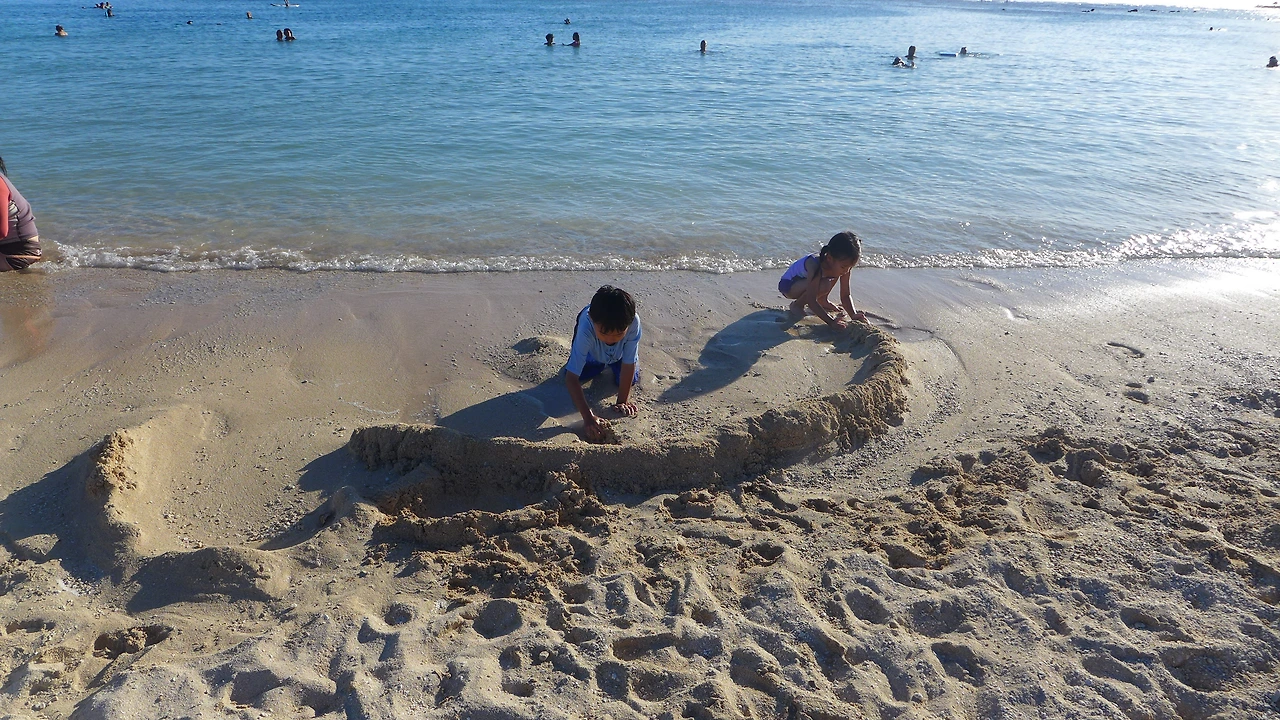 물고기가 보이는지 모래놀이 버킷을 들고 들어간다. 둘이 연신 손으로 무언가를 잡는 것 같더니 정말 자잘한 물고기들을 담아왔다. 이렇게 사람들이 노는 곳까지 물고기가 있다니 신기했다. 그리고 이 아이들에게 잡힐 정도의 물고기라면, 얘네들은 또 얼마나 어설프다는 말인가. 가여워서 모조리 풀어주기로 했다. 아이들은 늘 그렇듯이 모래성도 만들고 수영도 하고 중간중간에 간식도 먹으면서 시간을 보냈다. 바다에서 노는 스케일이 점점 커졌다.