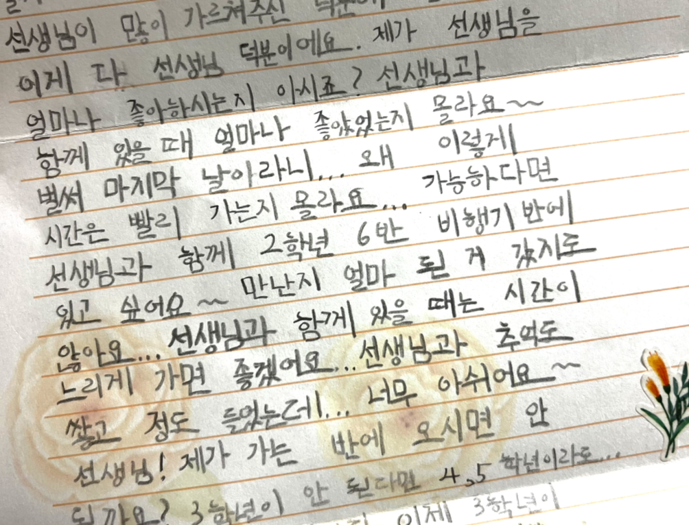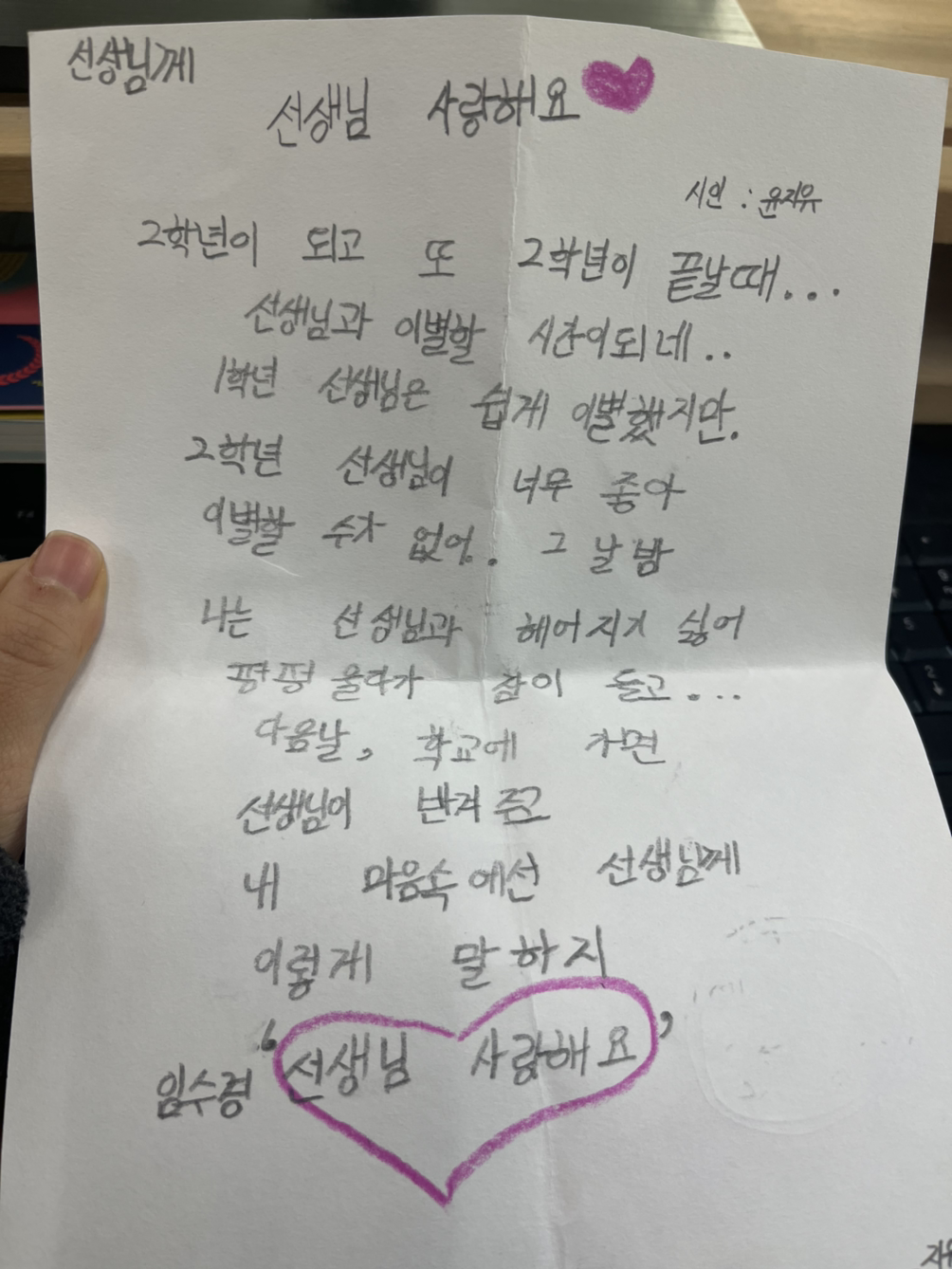 집에 돌아오고 나서 아이들의 편지를 읽다가 눈물이 흘렀다. 마지막으로 보내주시는 학부모님의 문자가 눈물에 염분을 더했다. 사진첩에 남아있는 아이들의 사진을 차마 더는 들여다볼 수 없었다.
