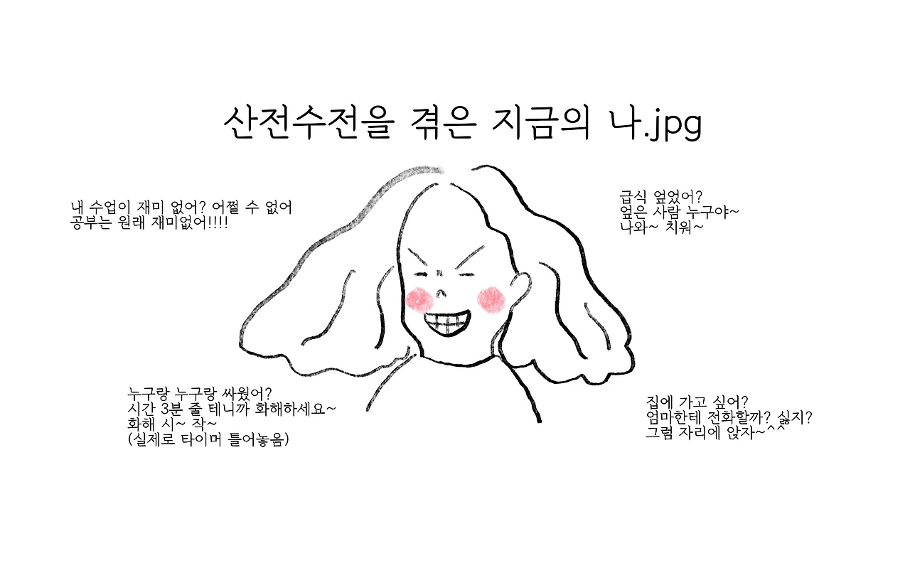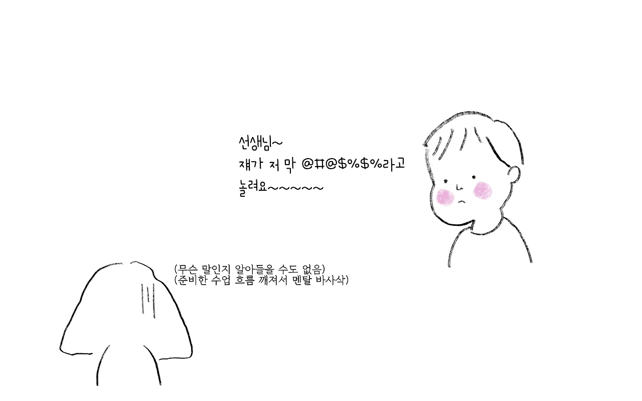 선생님 뚱뚱해요~ 선생님 못 생겼어요~ 라는 등의 몰라서 차리지 못하는 예의는 그렇다 쳐도, 수업이 재미없다, 학교가 싫다, 집에 가고 싶다는 등의 정말 '솔직함'에서 우러나오는 발언은 돌이 되어 내 가슴에 박히기도 한다. 이 아이들에게 행복하지 못한 학창시절을 만들어주는 것 같다는 죄책감은 덤이다. 이 아이들이 갖고 있는 학교에 대한 불만은 모두 다 내 책임인 것 같았다.