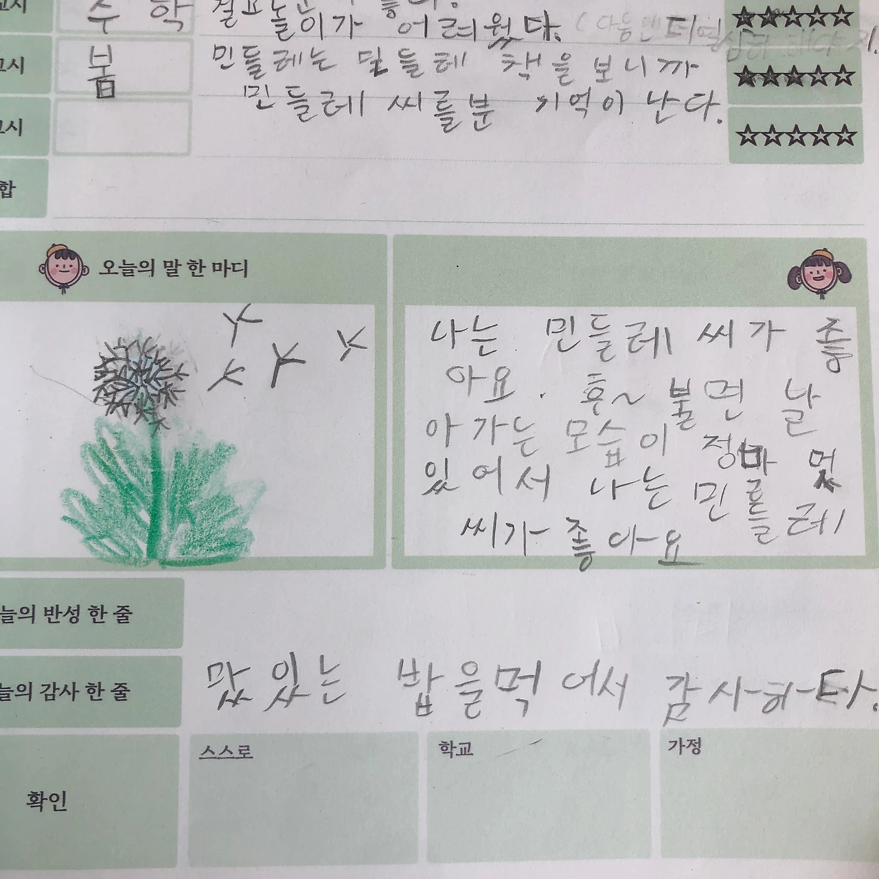 아홉 살 인생들은 생각보다 더 빛나고, 찬란했다. 나의 말 한마디, 표정 하나하나, 자그마한 손짓에도 쉽게 물결치는 것을 경험한 3월 한 달이었다. 그러니 내가 그린 그림은 어떻겠는가. 아이들에게 내가 연예인(?) 같다는 생각이 들 정도로 아이들의 칭찬이 줄을 이었다.