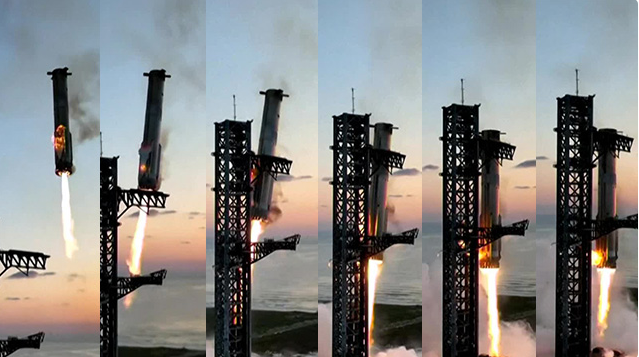 <스페이스 X 슈퍼헤비-스타십의 1단 로켓이 발사대로 돌아와 공중에서 두 개의 큰 팔에 안겼습니다>