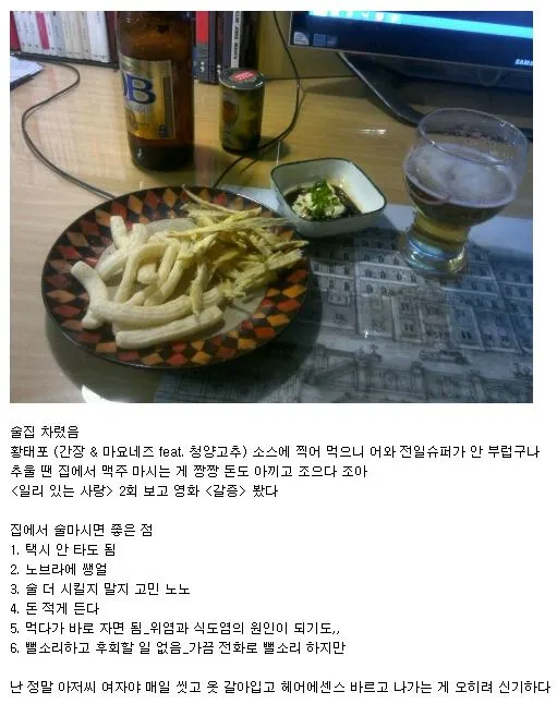 독립 후엔 모범 가장처럼 제때 집에 들어갔다. 나만의 공간이 있으니 굳이 밖에서 시간을 보낼 필요가 없었다. 퇴근길엔 설레는 맘으로 맥주를 사서 집에 갔다. 시원한 맥주를 마시며 영화를 보고, 간단한 안주를 해 먹고, 새벽까지 책을 읽었다. 세상 모든 행복이 나에게 몰려있는 것 같았다.
