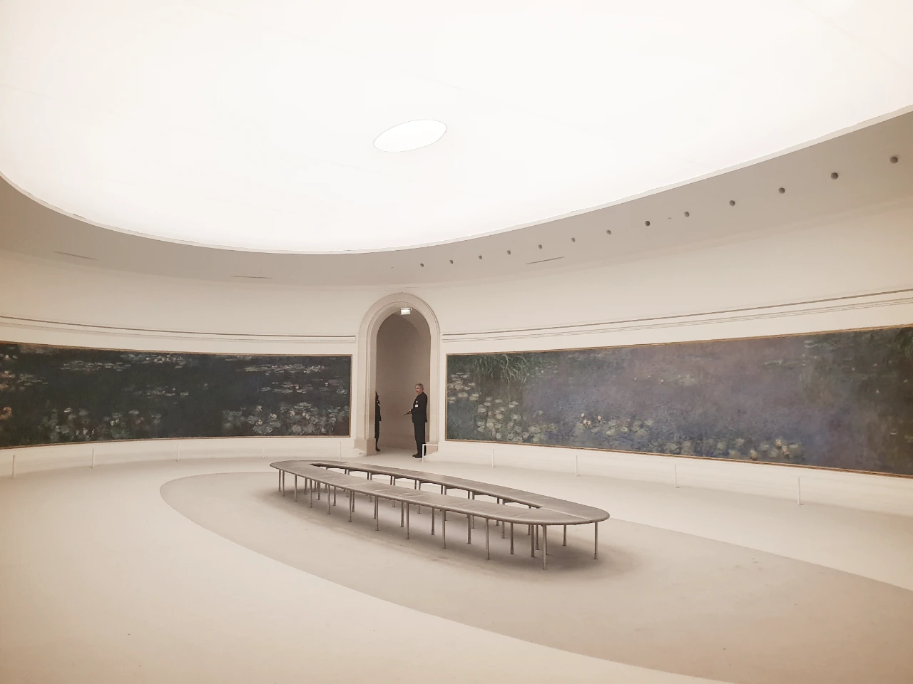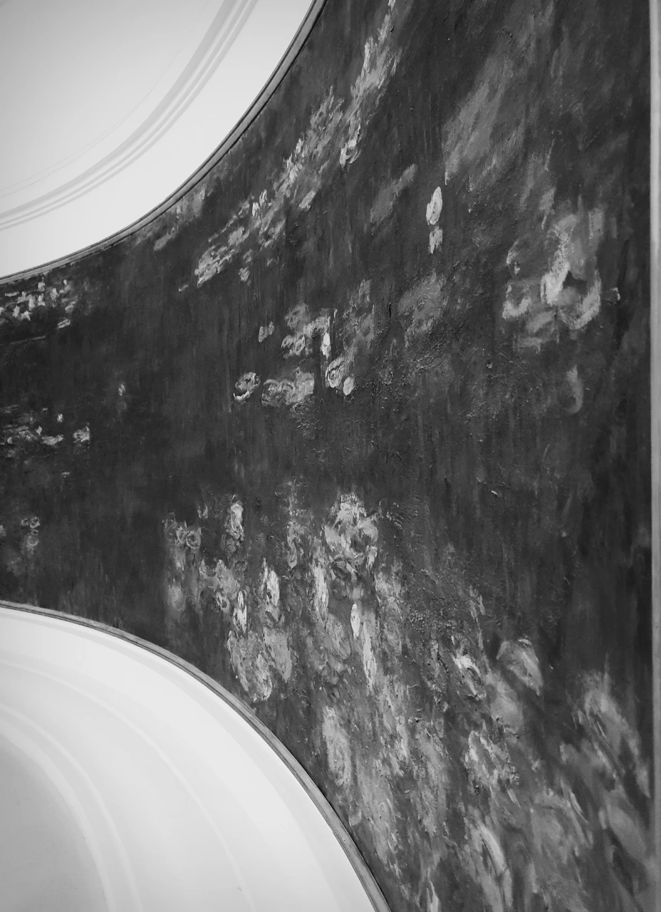 모네 <수련> 연작을 실물로 본 경험은 인상주의에 전반에 대해 다른 감각을 갖게 했다. 일차적으로 작품의 크기에 압도되고, 타원으로 휘어진 벽은 광각카메라의 굴절 또는 VR과 같은 입체감을 갖게 했고, 조명 또한 자연광과 비슷한 효과를 조성하여 작품 크기와 더불어 야외에 앉아 풍경을 보고 있는 것 같은 착각을 하게 한다. (내가 미술관을 방문한 시기에는 미술관 정비 기간이라 <수련> 연작을 제외하고 전시된 작품이 없었고, 평일 저녁에 방문하여 관람객이 매우 적었던 것을 밝힌다. 관람객이 많았다면 다른 경험을 했을 것이다.) 둥글고 넓은 공간에 상하좌우 각각 한 개씩 작품을 배치하고 가운데에 긴 의자를 놓았다. 관람객은 가운데 의자에 앉아서 또는 작품 가까이에 가서 나를 둘러싼 360도의 공간을 즐기면 된다. 어쩌면 오랑주리 미술관은 거의 모네의 <수련> 연작을 전시하기 위한 곳이기 때문에 본 작품들이 어떻게 관람 되기를 원하는지 고민을 많이 하지 않았을까 싶다. 오랑주리 미술관은 과거에 오렌지를 보관하기 위한 창고로 쓰였던 건물이기 때문에 처음부터 전시를 목적으로 지어진 건물이 아니다. 이 공간이 특별했던 것은 방이 직사각형 모양이 아니라 둥근 타원형 모양이라는 점이다. 처음부터 의도한 것은 아니었을테지만 휘어진 벽에 걸린 휘어진 작품들이 관람객으로 하여 새로운 경험을 하게 해주었다는 점이 인상적이었다.
