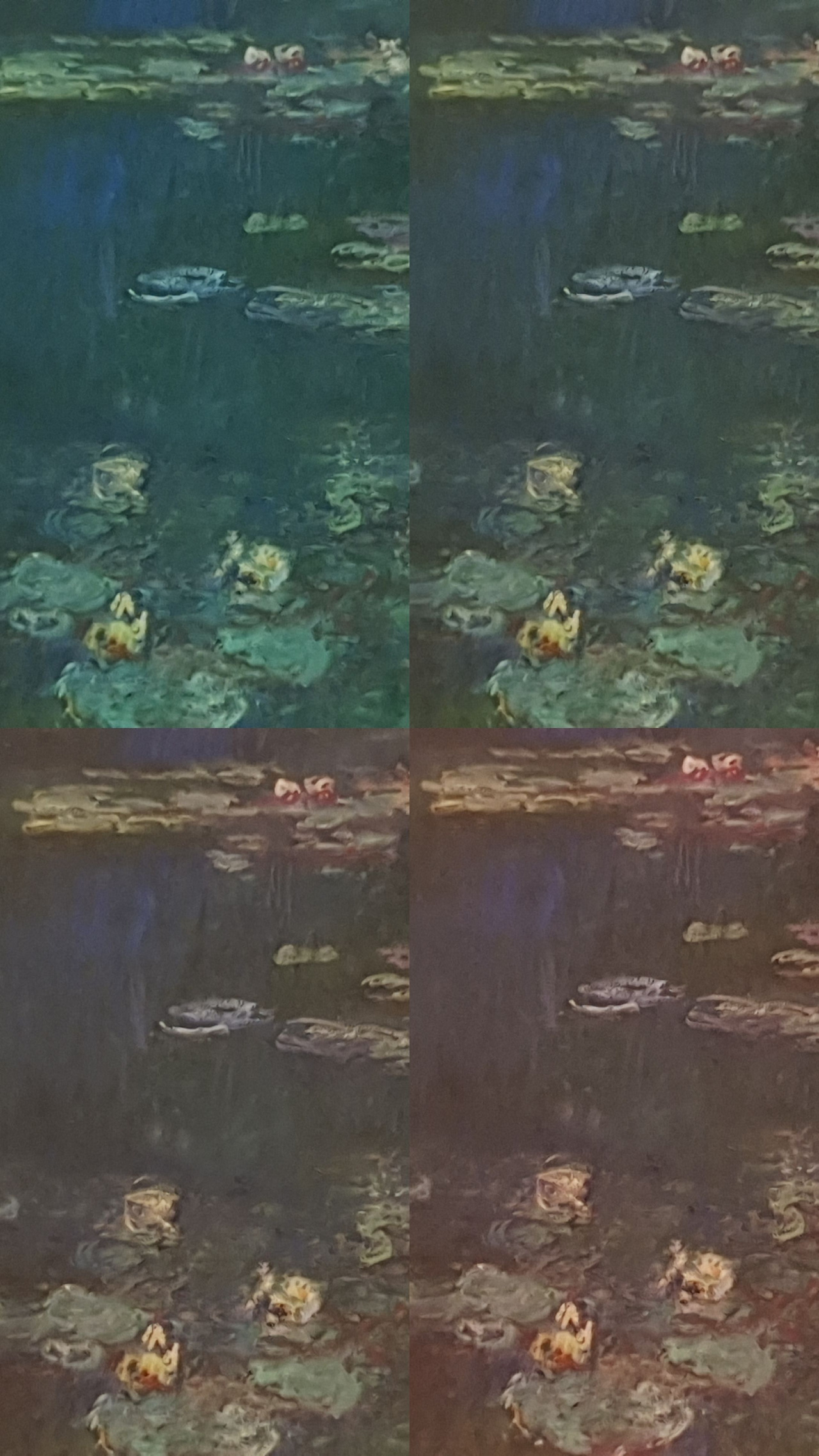 당연히 관람객들은 사진을 찍는다. 작품 앞에서 인물 사진을 찍는 사람들, 작품만 찍는 사람들, 작품 전체를 찍는 사람들, 작품의 부분을 찍는 사람들 등 다양하다. 그러나 그 사진에 담긴 작품이 모두 동일한 색을 가지고 있을까? 결코 아닐 것이다. 조명, 카메라의 특징, 각도 등 다양한 변수에 따라 같은 그림을 찍은 사진들에 나타난 색은 다 다를 것이다. 나 또한 사진을 찍다가 원본과 최대하게 비슷한 색감을 찾으려고 화이트밸런스를 맞추던 중, 화이트밸런스에 따라 다른 색으로 보여지는 이 그림들이 특별하게 다가왔다. 빛의 양과 파장에 따라 달라지는 이 색감들이 곧 모네의 눈이지 않았을까. 그렇게 화이트밸런스를 다르게 하여 사진을 찍어보니 끝내 나는 원본의 색감이 무엇인지 알 수 없게 되었다. 그러나 그건 더 이상 중요하지 않은 것 같다. [모그]