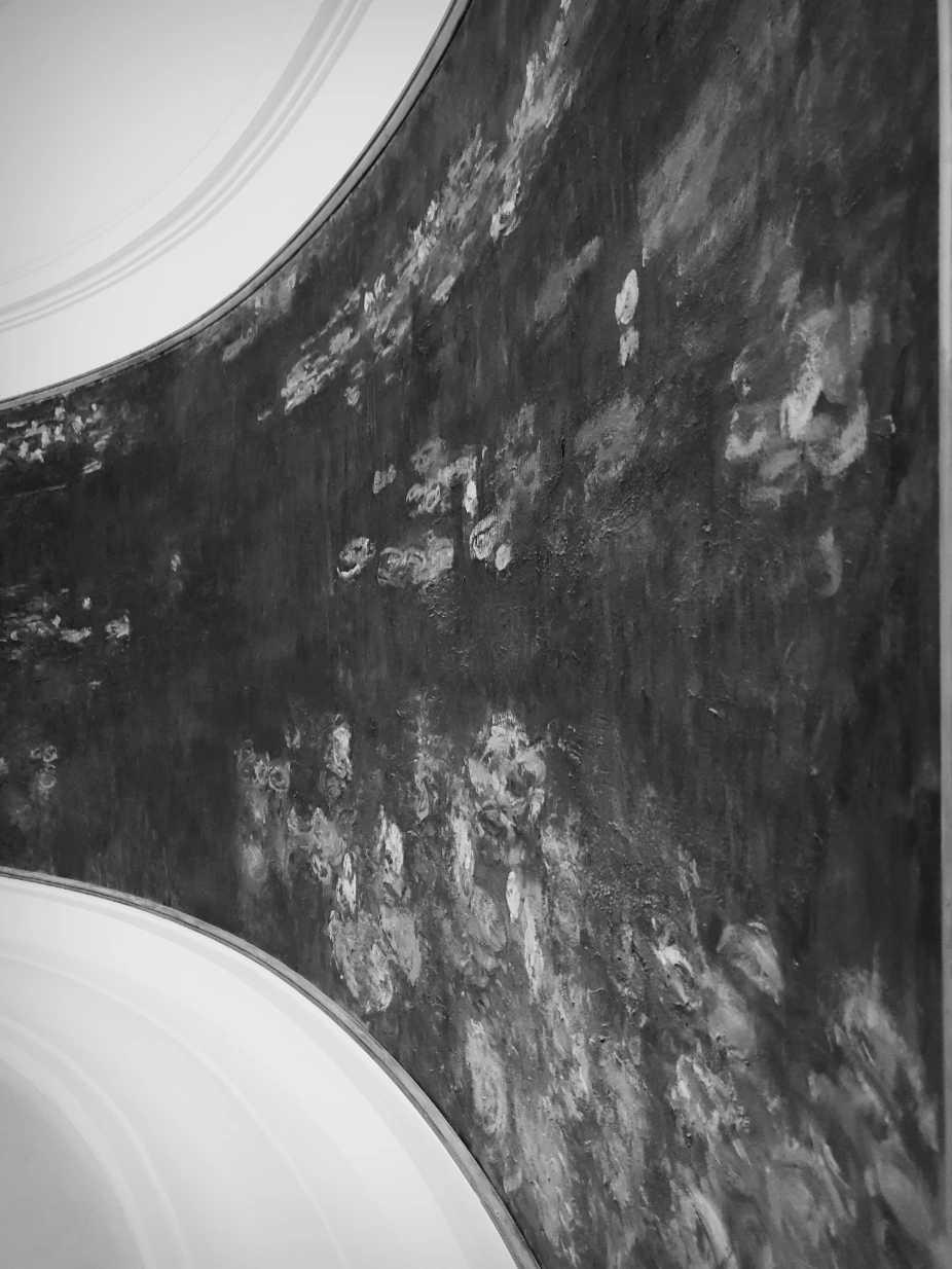 모네 <수련> 연작을 실물로 본 경험은 인상주의에 전반에 대해 다른 감각을 갖게 했다. 일차적으로 작품의 크기에 압도되고, 타원으로 휘어진 벽은 광각카메라의 굴절 또는 VR과 같은 입체감을 갖게 했고, 조명 또한 자연광과 비슷한 효과를 조성하여 작품 크기와 더불어 야외에 앉아 풍경을 보고 있는 것 같은 착각을 하게 했다. (내가 미술관을 방문한 시기에는 미술관 정비 기간이라 <수련> 연작을 제외하고 전시된 작품이 없었고, 평일 저녁에 방문하여 관람객이 매우 적었던 것을 밝힌다. 관람객이 많았다면 다른 경험을 했을 것이다.) 둥글고 넓은 공간에 상하좌우 각각 한 개씩 작품을 배치하고 가운데에 긴 의자가 놓여있다. 관람객은 가운데 의자에 앉아서 또는 작품 가까이에 가서 나를 둘러싼 360도의 공간을 즐기면 된다. 어쩌면 오랑주리 미술관은 거의 모네의 <수련> 연작을 전시하기 위한 곳이기 때문에 본 작품들이 어떻게 관람 되기를 원하는지 고민을 많이 하지 않았을까 싶다. 이 공간이 특별했던 것은 방이 직사각형 모양이 아니라 둥근 타원형 모양이라는 점이다. 오랑주리 미술관은 과거에 오렌지를 보관하기 위한 창고로 쓰였던 건물이기 때문에 처음부터 전시를 목적으로 지어진 건물은 아니다. 처음부터 의도한 공간 형태는 아니었을테지만 휘어진 벽에 걸린 휘어진 작품들이 관람객으로 하여 새로운 경험을 하게 해주었다는 점은 인상적이었다.