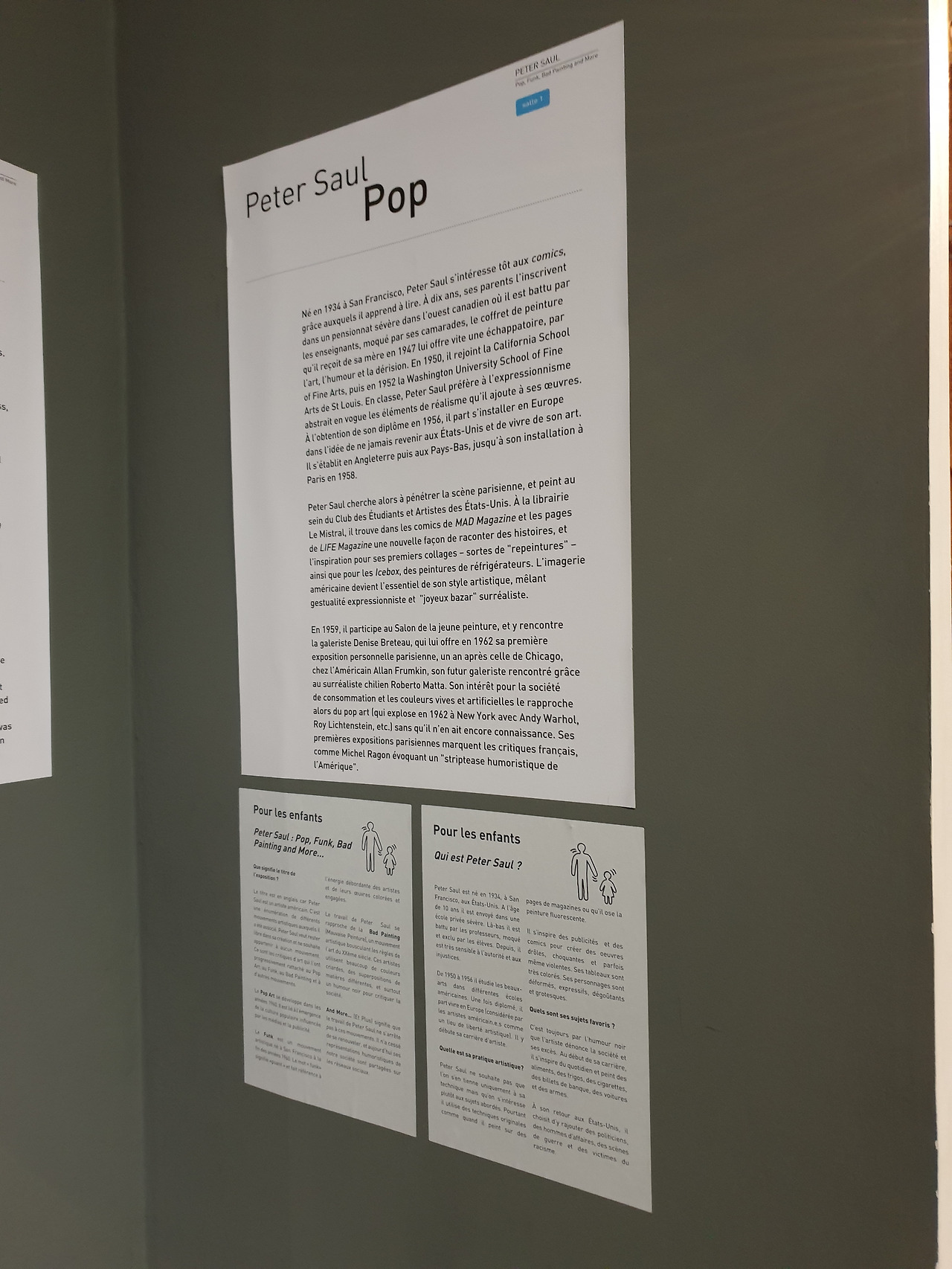 전시관에 가면 작품 옆에 붙어있는 해설은 성인을 위한 것이다. 글이 배치된 높이부터 성인의 눈높이에 형성되어 있고, 어휘나 문장 구조 또한 성인에 맞춰져 있다. 이는 매우 필요하지만, 우리에게는 한 가지 필요한 게 더 있다. 아동의 높이에서 아동의 언어로 쓰인 글이 필요하다. 아동을 위해 미술의 언어를 한 번 더 번역해보자는 것이다. 그러나 이런 추가적인 번역 과정이 과연 아동들을 위한 것은 아니다. 마치 에스컬레이터가 노약자만을 위한 것이 아닌 것처럼 말이다. 아주 개인적인 경험의 예로, 프랑스 소도시에 있는 미술관에 갔을 때 일반적인 설명문 아래 아동을 위한 설명문이 있었다. 실제로 그 공간에는 아동, 청소년이 매우 많았고 자유롭게 돌아다니며 서로의 생각을 자신들만의 언어로 공유하고 있었다. 이와 동시에 그 쉬운 버전의 설명문의 도움을 받은 사람은 바로 나랑 내 친구였다. 프랑스 친구 또한 그 쉬운 설명을 읽으면서 나에게 영어로 번역을 해주었다. 어쩌면 쉬운 문장 구조와 어휘로 구성된 설명문은 외국인에게도 반가운 일일 것이다. 혹자는 이런 질문을 던질 수도 있겠다. 위에 제시된 Peter Saul의 작품의 "불건전성"을 어떻게 아동의 언어로 번역을 하냐며 말이다. 그러나 여기서는 작품의 외형적 특징과 선정성이 아닌 Peter Saul의 예술관과 그의 팝아트가 가지는 예술사적 의미와 특징을 기술하고 있다. 내용의 적절성은 각자 판단에 맡긴다.