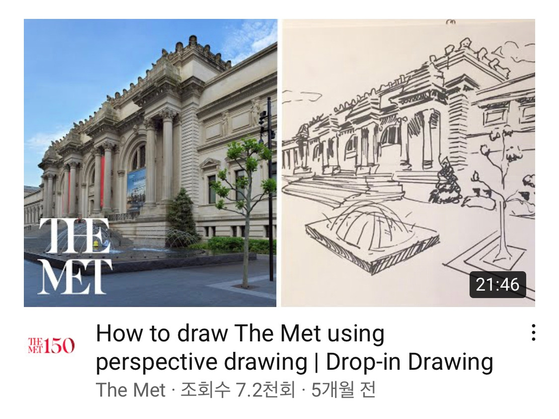 The Met에 업로드된 여러 영상 중 첫 번째 영상에서는 원근법을 이용해 메트로폴리탄 미술관의 외관을 찍은 사진을 그린다. 영상을 보며 가장 인상적이었던 말은 첫 시도에서 완벽한 작품을 기대하지 말고 그저 즐기라는 말이었다. 이 말을 듣고 결국 아무것도 그려내지 못하고 박물관에서 돌아왔던 과거의 내 모습이 떠올랐다. Drop-in Drawing 영상 속 드로잉들만 보더라도 작품의 완벽한 재현이 목표가 아님을 알 수 있다. 중요한 것은 그림을 그리며 작품을 자신만의 시각으로 바라보는 것과 그림을 그려낸 후 생겨나는 작품에 대한 일종의 애착이다. 시간을 들여 한 대상을 바라보고 선을 하나씩 쌓아 그림을 그려가면 시간과 노력이 담긴 하나의 이야기가 만들어지게 된다. 분명 그림이 완성된 후 작품을 바라보는 마음은 이전의 그것과는 분명 다를 것이다. 미술관들이 하나둘씩 다시 문을 여는 요즈음, 그리고 코로나가 종식된 그 이후에도 가벼운 마음으로 드로잉 북 하나와 그림을 그릴 도구 하나를 가지고 미술관에 방문해보는 것은 어떨까?