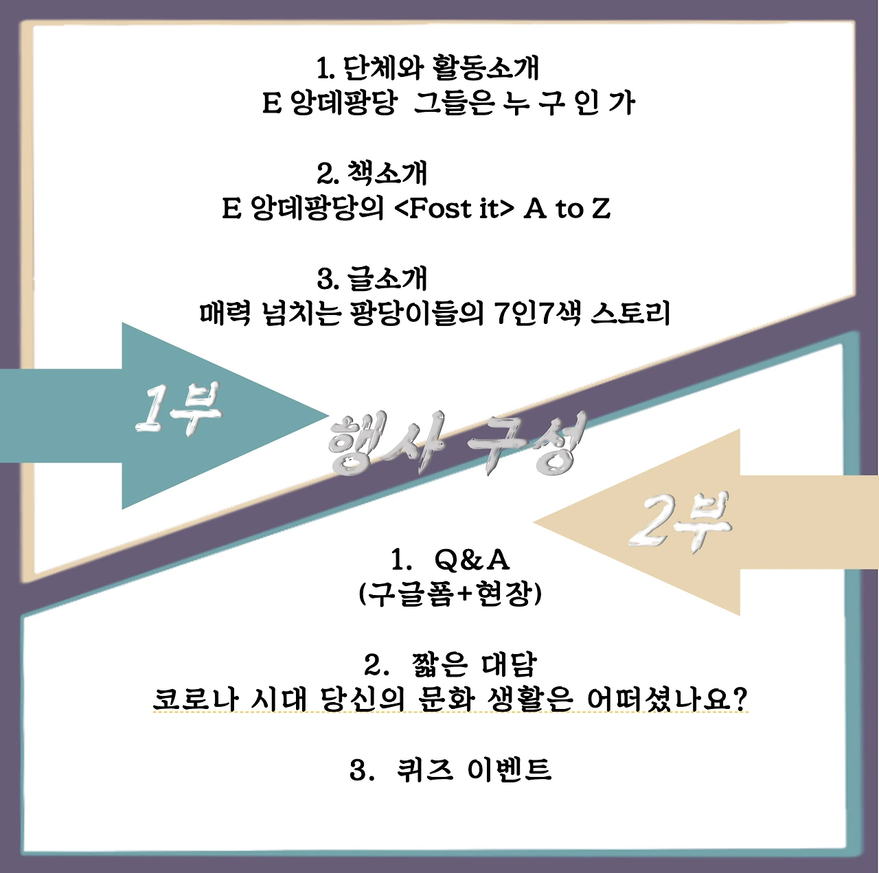 책을 아직 읽지 않으셨더라도 평소 저희 활동에 애정을 가지고 지켜봐주신 분들이라면 누구나 참여 가능합니다! 처음으로 독자분들과 만나는 자리인 만큼 E 앙데팡당의 모든 것을 보여드리려 합니다. 출판 과정과 에피소드, 글 소개와 더불어 여러분과 대화를 나눌 수 있는 짧은 대담과 퀴즈이벤트까지 다양한 컨텐츠로 진행되니 많은 관심 가져주세요! 퀴즈 이벤트 당첨자분들에게는 저희가 직접 제작한 떡메모지와 그립톡을 선물로 드립니다.