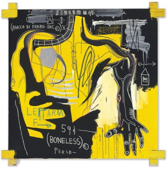 바스키아는 어릴적 심한 교통사고를 당해 팔이 부러지고 내장이 다쳐 장기간 입원생활을 보낸 적이 있다. 그런 그에게 어머니는 '그레이의 해부학'이라는 해부학 입문서를 선물했는데 이 책은 그의 이후 작품 생활에 많은 영향을 끼친 듯하다, 인체, 뼈, 장기, 근육의 구조를 탐구하고 그것을 표현하는 방식을 연구하여 탄생한 그만의 독특한 신체표현이 많은 작품에서 나타난다. 이 작품에서도 볼 수 있는데, 인간의 상체의 형상이 그 특유의 거칠고 자유로운 드로잉으로 상체 내부의 뼈와 근육 등을 표현하여 해부학적 형상으로 그려져있고, 그것을 표현하는 단어가 쓰여져있다. Baraco di ferro는 무쇠팔이라는 이탈리어이다. 힘있고 거친 선과 노랑과 검정의 대비로 이 작품에서 더욱 강렬한 에너지가 느껴진다.