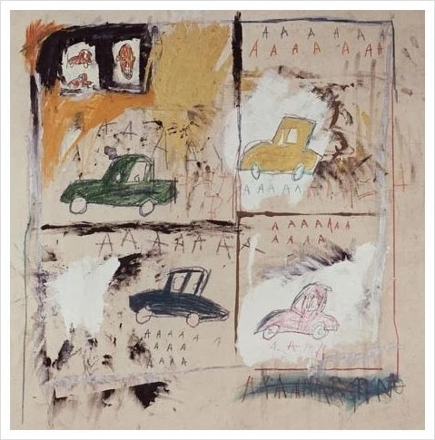 네 개로 분할된 화면, 마치 낙서처럼 정리되지 않은 선, 각 화면에 서로 다른 컬러의 올드카, 비명을 지르는 듯한 알파벳 A의 반복적인 나열. 이 작품은 그가 7세에 경험한 교통사고를 나타낸 듯 하다. 자동차는 그가 즐겨 그린 소재 중 하나로 부와 권력이자 뉴욕이라는 도시를 상징하였다. 오른쪽 상단에 자동차 두대와 화난 얼굴이 붉고 작게 그려져있다. 그 주변으로 붉고 노란 색감의 터치가 매우 거친데, 마치 그가 겪은 사고의 현장감을 보여주는 것 같다. 그 특유의 낙서 같은 불안정한 터치 때문인지 자동차 사고가 더욱 감정적으로 느껴진다.