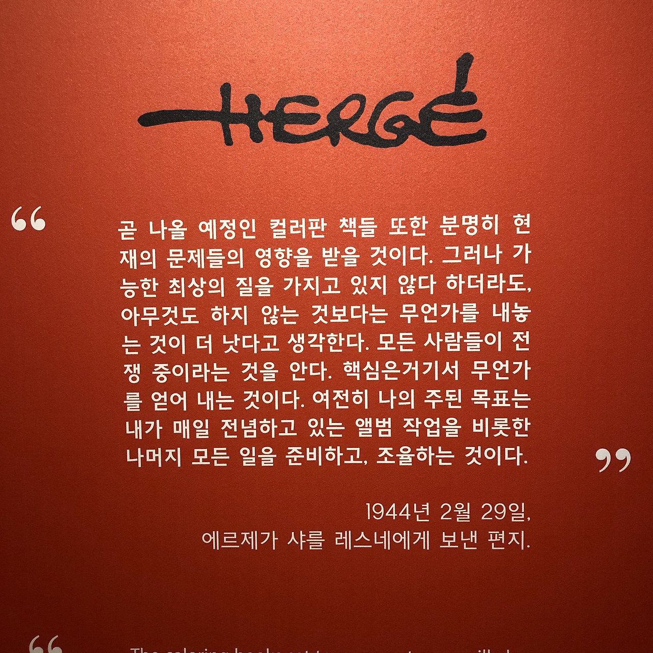 다시 본론으로 돌아가자면, 땡땡전은 작가 회고전이라는 본래 목적에 잘 부합한다. 어떤 삶을 살았고, 어떤 사람이었는지 전시를 보며 알 수 있다. 상당히 똑똑하고 열정적인 사람이었으며 인간적인 매력이 넘쳤던 것 같다. 한 인간에 대한 이야기다 보니(그것도 한 세기 전 유럽 백인 남성의 이야기이다 보니!) 인종 문제나 친나치 행보 등 지금 시각으로 불편한 부분이 있지만, 으레 회고전이 그렇듯 이 모든 인간적 결함은 긍정적으로 덮인다. 인종 차별은 그의 중국인 친구 ‘창총첸’씨와 친분으로, 친나치 신문에 만화를 연재한 건 종전 후 무혐의를 받은 것으로 덮인다. 무결한 인간임을 증명이라도 하고 싶은 듯이 말이다. 똑똑하고 사회에 관심 많았던 백인 남성이 상황에 맞추어 적절히 현실과 타협하며 살았다, 를 포장하는 서사는 보이는 것 이면의 인간성을 궁금하게 만들었다.