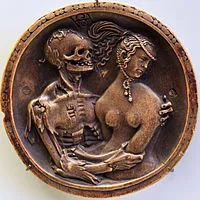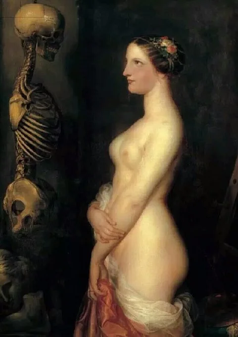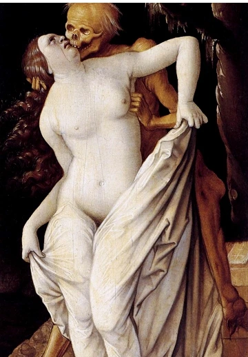젊은 여성의 육체와 죽음을 연관시킨 예시를 또 들자면, ‘죽음과 소녀’ 도상이 있다. 해골로 표현되는 죽음과 생생한 육신을 가진 소녀가 함께 등장하고 대부분 젊은 여성이 죽음에게 능욕을 당하고 있다. 이 도상은 생의 덧없음을 주지시킨다는 점에서 메멘토 모리와 연관성을 갖기도 한다. 아래 두 그림을 보자. 이 그림들에서 해골은 특정 성의 신체적 특징을 갖고 있지는 않다. 다만 판판한 몸의 형태와 짧은 머리, 두 인물의 관계성으로 보아 남성의 역할을 하고 있음을 짐작할 수 있다. 이후 뭉크나 실레의 작품에서 죽음이 남성 또는 작가 자신으로 나타나는 경우도 있으니 아예 근거 없는 추측은 아니리라 생각한다. 예외적으로 19세기 작가인 앙투안 조세프 비르츠는 그림 속 해골을 여성의 사후로 명시하고 있다. 그러나 그의 그림 속 죽음은 소녀를 능욕하지 않고 서로를 바라보고만 있기에 가능한 설정이므로 일반적인 경우는 아니다.