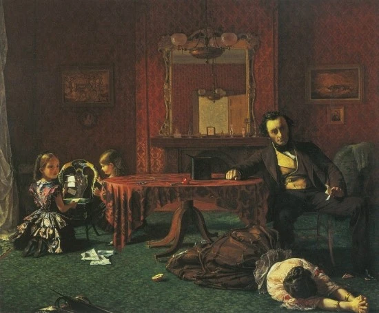<화려한 집안과 인물들의 옷차림은 당대 중산층 가정을 연상시킨다. 왼쪽 구석에서 아이들은 불안하게 오른쪽을 보고 있으며, 공들여 쌓은 카드 탑은 무너진다. 남편은 의자에 앉아 권위적으로 아내를 내려다보고 있는 것에 비해 아내는 바닥에 붙은 듯 굴욕적으로 용서를 빈다. 쓰러진 여성의 왼쪽으로 떨어져 있는 과일은 부인의 성적인 타락, 불륜을 의미한다. 불륜으로 버림받은 여인은 뒤늦은 반성을 하지만 처참한 모습으로 다리 밑에서 과거를 그리워하는 처지가 된다.>