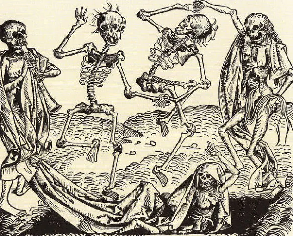 본인은 극한에 몰린 중세인들이 미쳐버렸다고 생각한다. 그렇지 않고서야 ‘죽음의 춤’ 도상의 확산을 어떻게 설명할 수 있을지 모르겠다. 질주하는 죽음을 앞두고 자기반성을 아무리 하여도 구원의 손길이 내려오지 않자 이들은 두려움에 미치기라도 한 듯 적극적으로 죽음을 받아들인다. 성별과 노소를 불문하고 묘지에 모인 사람들이 죽을 때까지 춤을 추었다는 이야기가 책 속에 종종 등장한다. 이 일화를 증명이라도 하듯 그림 속에서 죽음과 손잡은 이들은 성별과 신분을 막론하고 같은 위치에서 비슷한 모습의 죽음과 춤을 춘다. 해골이나 썩은 시체로 대변되는 죽음은 신체 특징이 드러나기도 하나(우측 그림 가장 오른쪽 해골에게 가슴이 있는 것처럼), 이 묘사는 성적인 의도를 드러낸다고 말하기 어렵다. 신분과 나이, 성별을 막론하고 죽음은 모두에게 평등했음을 ‘죽음의 춤’이 말하고 있는 것이다.