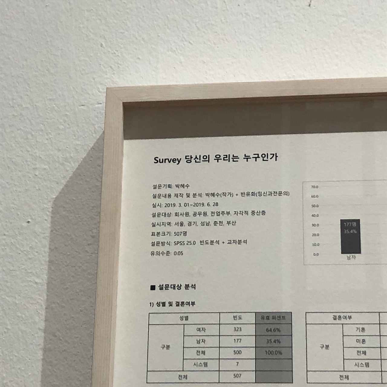 ‘우리’라는 문제의식을 던진 작품은 박혜수 작가의 <당신의 우리는 누구인가, 우리의 당신은 누구인가>이다. 사회와 집단에 내재된 보편적 가치와 무의식을 시각화한 작품으로 ‘당신의 우리는 누구인가’라는 물음에서 시작한다. 우리에 대한 정의와 범주 즉 집단에 대한 인식을 살펴보기 위해 표본집단을 대상으로 설문을 진행하였고, 이에 대한 결과를 설문지와 함께 전시했다. 필자는 이 작품을 통해 각자 ‘우리’를 생각하는 무수한 정의와 범주가 있다는 점, 그리고 필자 역시 나름의 정의와 범주를 가지면서 동시에 ‘우리 밖’에는 얼마나 무감각하고 배타적인 감정을 가져왔는지 알 수 있었고 이게 얼마나 위험한 일인지 아래의 작품을 통해 깨닫게 되었다.