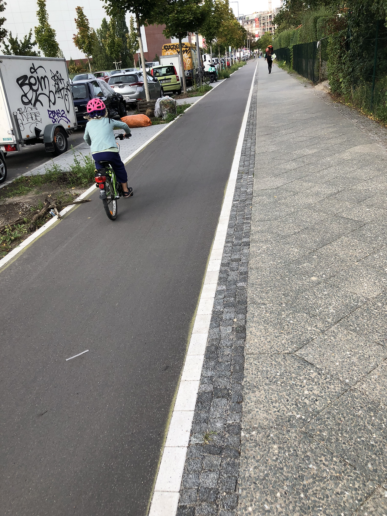 상황이 이러하니 인도 위에, 차도 위에 자전거를 위한 길이 당연히 따로 만들어져 있다. 보통 예쁜 색깔로 칠해져 있다. 참 사람이 이상한 게 꼭 그런 도로로 걷고 싶음 욕망이 있다. 왠지 더 보들보들해 보이고, 더 새 거 같고 그래서 그런지. 아니면 예쁜 아스팔트를 밟고 싶은 건지. 나도 잘 모르겠는 내 속을 짐작해 보건대 아마 울퉁불퉁한 독일의 길을 걷다가 잘 닦여있는 아스팔트를 보면 좀 더 걷기가 편해서 인지 그 길로 가고 싶어 했던 것 같다.
