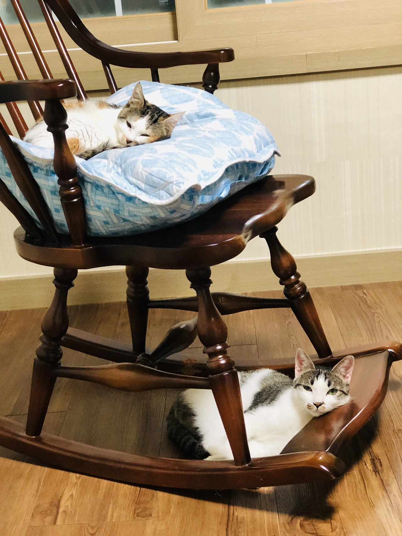 고양이들만 두고 나가있는 시간이 많을 수밖에 없을 정도로 열심히 일했다. 그래서 귀촌하자마자 만두가 찾아온 것은 어쩌면 다행이라고 생각했다. 처음에 서로 으르렁거리던 것도 잠시, 고등어와 만두 둘이 서로 포개져 누운 채로 귀가한 나를 맞이하는 모습이 참 다행스러웠다.