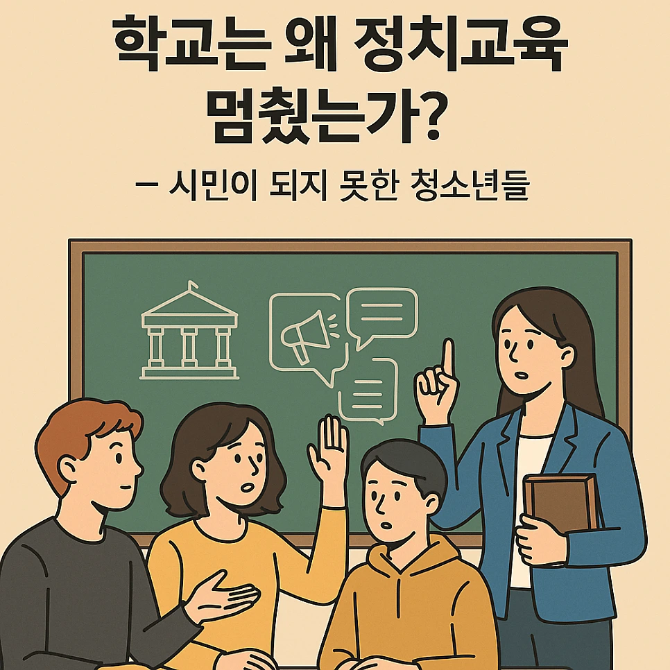 학교는 사회의 축소판이라 불리지만, 유독 ‘정치’만은 철저히 배제하려 한다. 정치적 중립이라는 미명 아래, 학생은 정치적 존재가 아니며, 교사는 정치에 관여할 수 없는 사람으로 간주된다. 그 결과, 학교는 살아 있는 사회의 핵심 기능 중 하나인 정치교육에서 철저히 눈을 감는다.