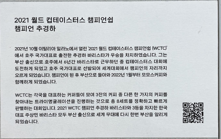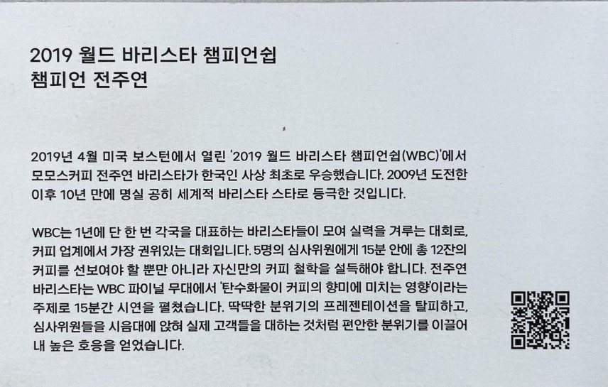 전세계 55개국에서 온 국가대표 바리스타를 제치고 우승컵을 들어올린 전주연 대표님, 그녀는 3천명 중에 1위를 차지했으며, 대한민국 최초로 우승을 했다고 해요. 2009년 대학 졸업과 동시에 알바로 시작한 카페, 그리고 10년만에 세계 1위 바리스타가 되었습니다. 호주인 폴 바셋이 2003년 WBC에서 우승해 세계적인 명성을 얻었던 바로 그 대회에서 말이죠!!