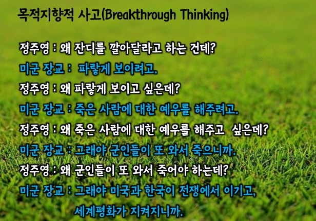 무슨 일을 하든지 먼저 그 일의 목적 (존재이유, 가치, 미션)을 파악하는 사고를 "목적지향적사고" 라고 합니다.