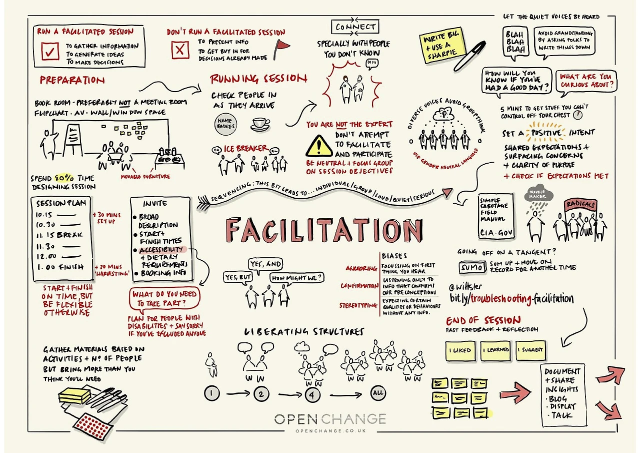 미팅을 운영함에 있어서 테마 선정, 참석자 선정, 양식 정의, 미팅 진행, 그룹 활동과 토론의 총괄 등을 진행 촉진 활동이 요구됩니다.