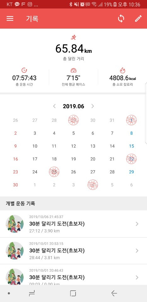 혼자 달렸으면 적당히 뛰다가 집으로 돌아왔을텐데, 어플에서 정해진 코스에 맞춰 달리다보니 꽤 오래 달릴 수 있었다. 일주일에 2~3번을 목표로 달리기 시작했다. 5월 말에 처음 시작했던 달리기는 (조금 뜸할 때도 있었지만..) 10월인 지금까지 꾸준히 달리게되었고 어느 정도 생활의 일부로 자리잡았다.