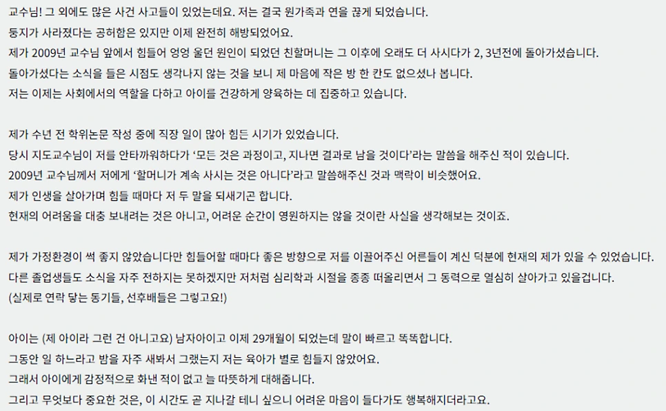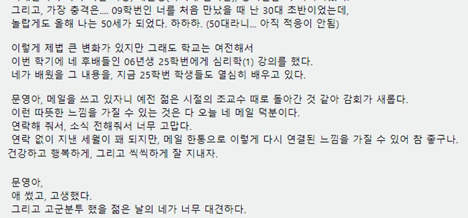 여느 날과 같이 일을 하던 나는 어떤 링크를 하나 받는다. 그 교수님께서 학교 건의 게시판에 작성하신 글이었다. 요컨대 학교 도서관 초청 저자특강 강사로 특정 인물이 부적절하단 점을 조목조목 적어 이 특강이 취소되어야 한다는 글이었는데 글을 읽고 있다 보니 그 시니컬한 어투가... 왠지 모르게 16년 전의 상담 장면이 떠오른다. 할머니 때문에 힘들어요. 우는 아이에게 할머니는 언젠가 죽을 거야. 위로해 주셨던 인지과학자의 깊은 위로와 목소리가 다시금 떠올랐다는 것이다. 나는 내 직장의 포탈에서 '메일 쓰기'를 누르고 생각 없이 써 내려갔다. 그간의 내 근황, 친할머니가 죽었다는 사실, 그리고 16년 전 당신의 한 마디가 나에게 어떤 영향을 주었는지... 개인 계정이 아니고 포탈 계정으로 작성했던 것은 메일 하단의 꼬리말에 삽입되는 내 소속과 이름, 내선번호를 보여주기 위함이었을지도.