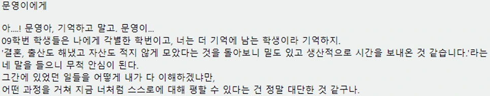 기억에 남는 학생이었다는 말이 순간 약간 머쓱했는데 내가 대학 다닐 때 요즘말(도 아니고 유행지난 말)로 관종이고 나댔거든. 지금의 내가 차마 떠올리지 못할 만큼 어리고 미숙했어서 그 시절이 짧게 떠올랐다.