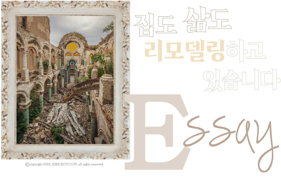 이 공간의 철거가능한 온갖 것들을 모조리 없애버리겠다는 결연한 의지 아래, 찢길 듯 요란한 소음이 파편들에 뒤섞여 살벌하게 터져 나간다. 그 인정 없는 난도질 광경은 마치 오랜 세월 이 집에 표류한 과거의 망령마저 추방시키려는 듯 격렬하다 못해 광폭할 지경이다. 행여나 이러다 오만곳이 부서지면 안 되는데 싶은 소심한 우려의 마음도 잠깐, 구석구석 신기하게 변해가는 나의 새로운 집을 탐험한다.