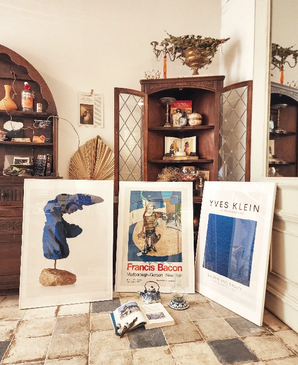 온갖 이국적인 것들에 매료된 1900년대 예술가가 파리 아틀리에 안에 자신의 작품과 생경한 타국의 정취를 낭만적으로 녹여냈듯, 나도 지난 여행지에서 모아 온 추억의 산물들로 이 서재를 채웠다. 입구를 들어서며 가장 먼저 시선이 가는 벽면에는, 우아한 네오 르네상스 양식의 미술관에서 가져온 A1사이즈 전시 포스터를 걸어 두었다. 크기가 제각기 다른 액자들도 무심한 척 바닥과 가구에 기대 두면, 금세 갤러리 같은 무드를 자아낼 수 있다.