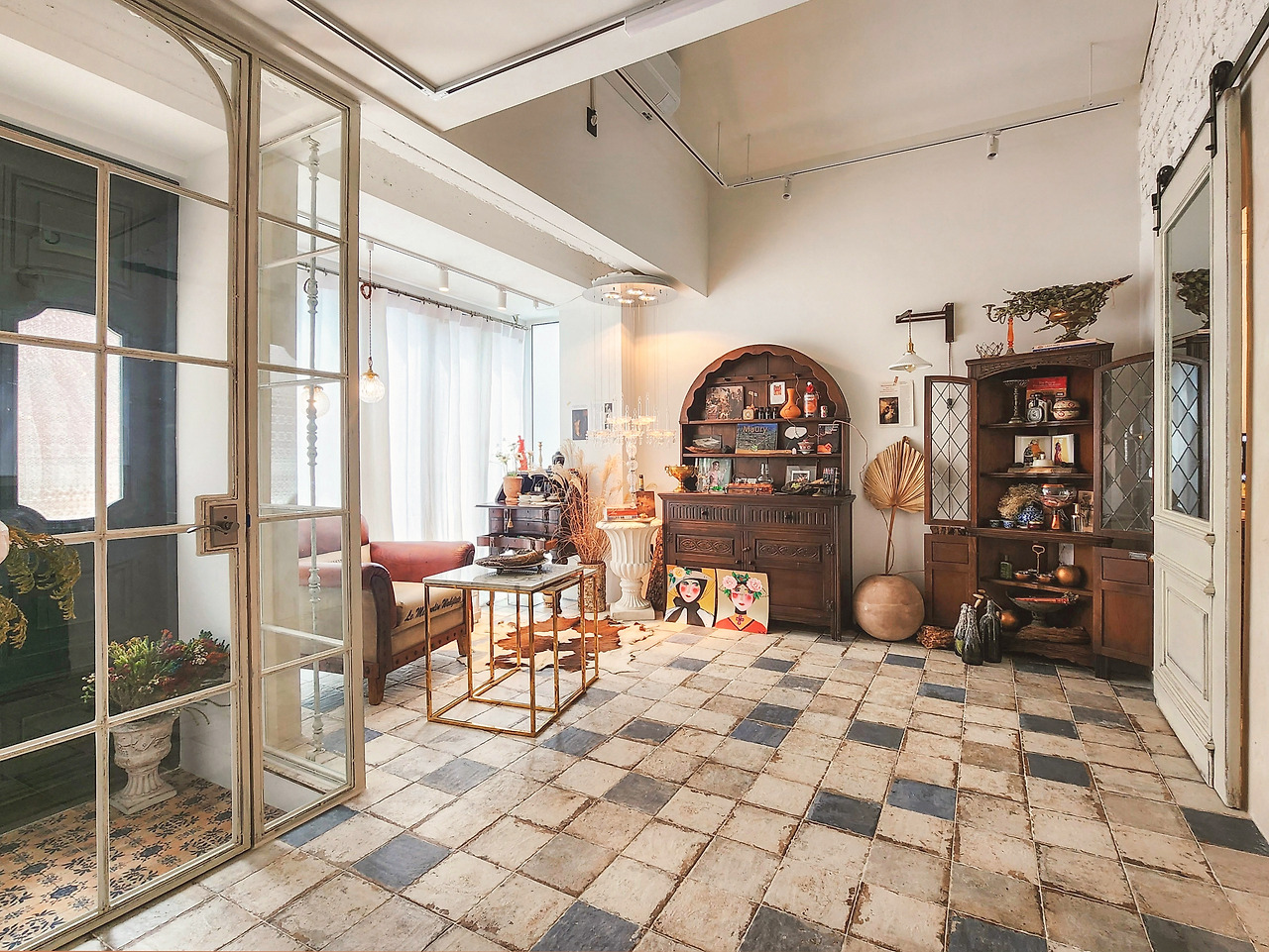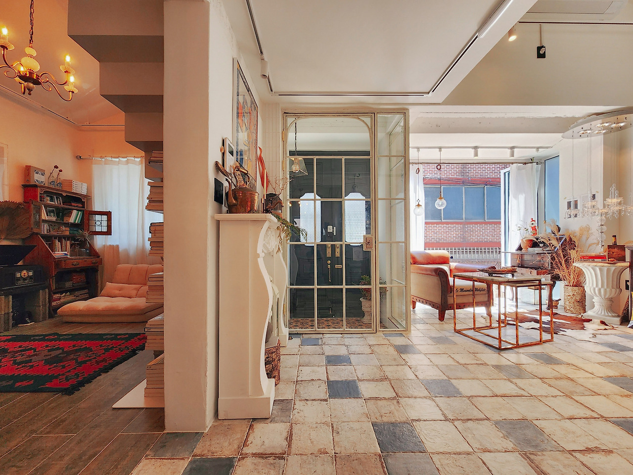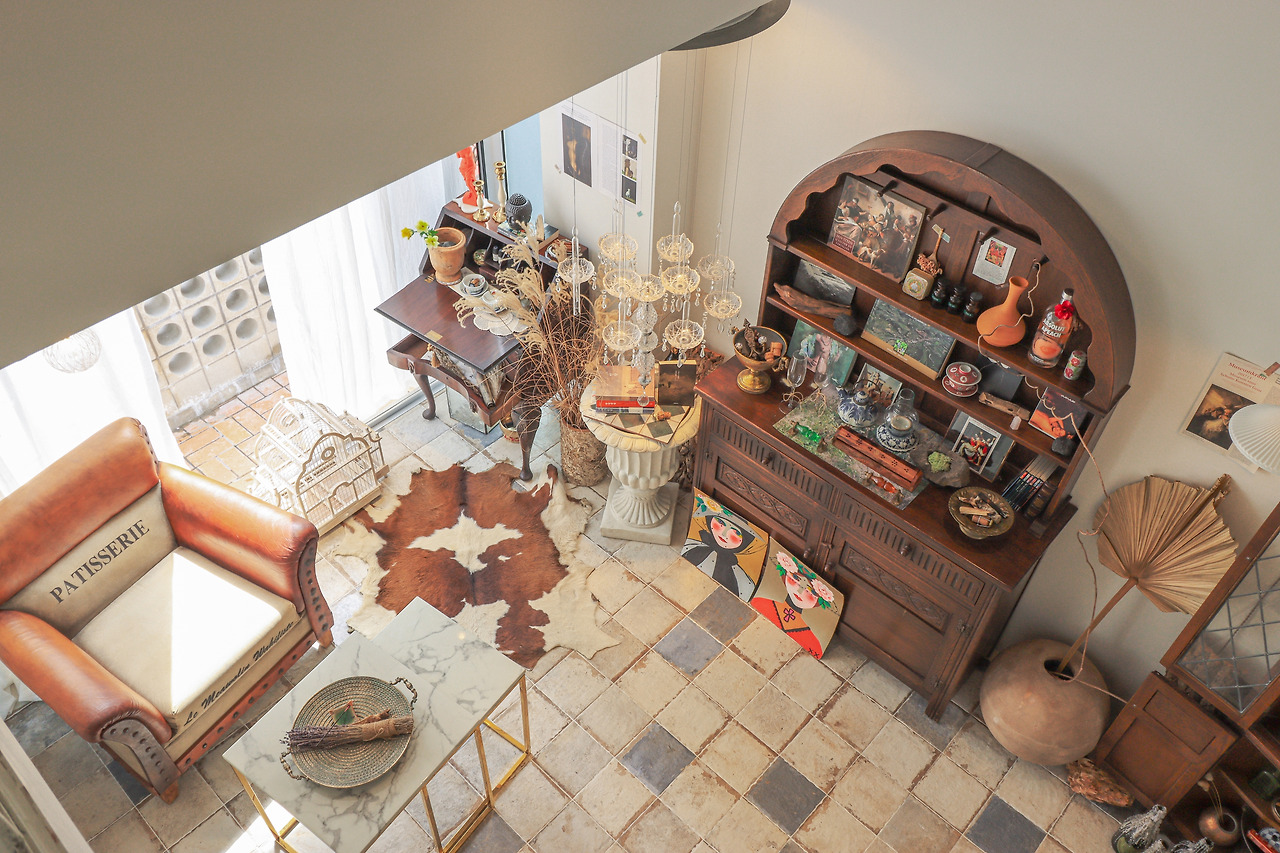 빈티지 양개 도어와 철제 단조, 안달루시아풍 패턴 타일과 천연 석회 미장재 등 유행을 타지 않는 이국적인 자재들은 시간이 흐를수록 고풍스러워지는 감각의 깊이를 직조합니다. 높은 박공 천장의 공간감과 복층이 만들어내는 시네마틱한 앵글은, 그 어떤 평범한 오브제도 빛날 수 있는 고유한 질감의 배경이 됩니다. 서울 도심에서 이 정도 층위의 미학적 오리지널리티를 지닌 공간은 극히 드물죠.