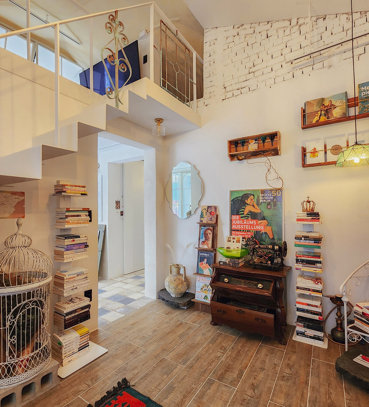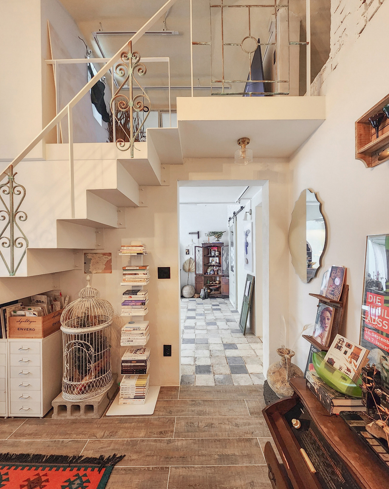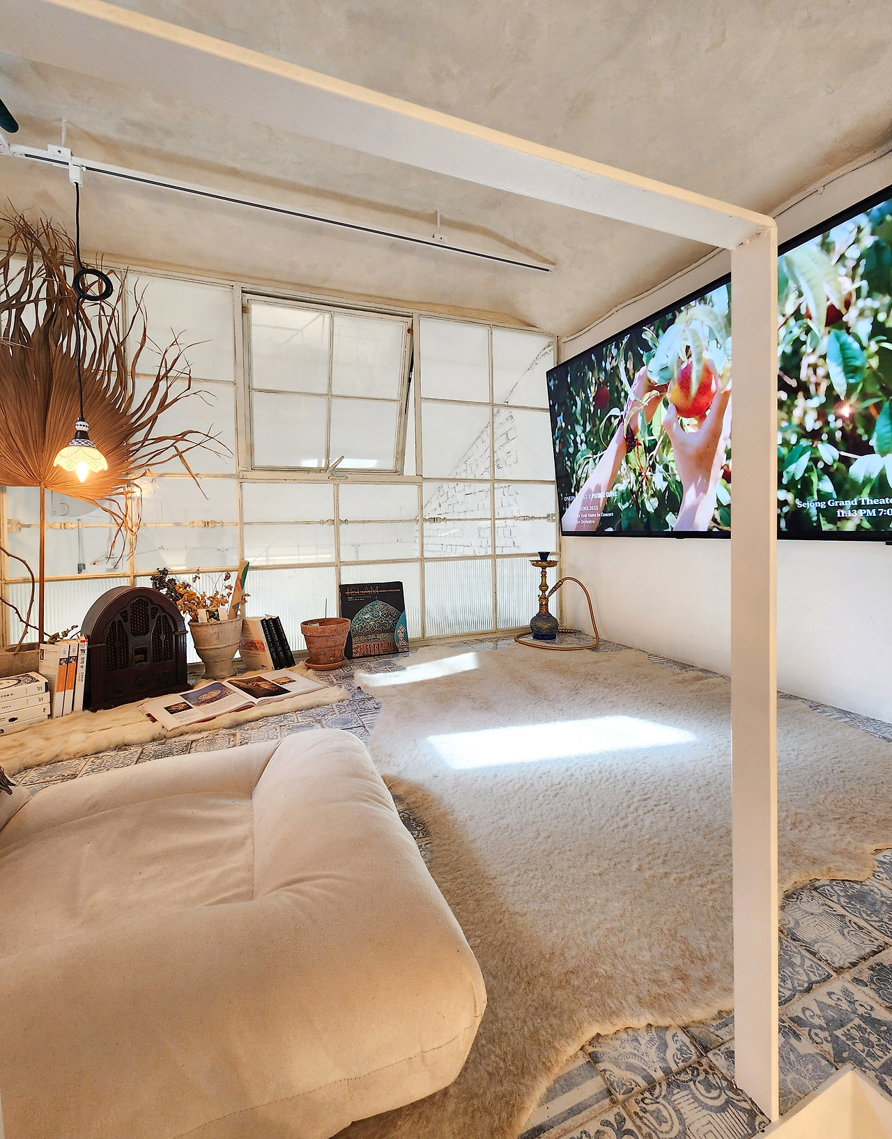 빈티지 양개 도어와 철제 단조, 안달루시아풍 패턴 타일과 천연 석회 미장재 등 유행을 타지 않는 이국적인 자재들은 시간이 흐를수록 고풍스러워지는 감각의 깊이를 직조합니다. 높은 박공 천장의 공간감과 복층이 만들어내는 시네마틱한 앵글은, 그 어떤 평범한 오브제도 빛날 수 있는 고유한 질감의 배경이 됩니다. 서울 도심에서 이 정도 층위의 미학적 오리지널리티를 지닌 공간은 극히 드물죠.