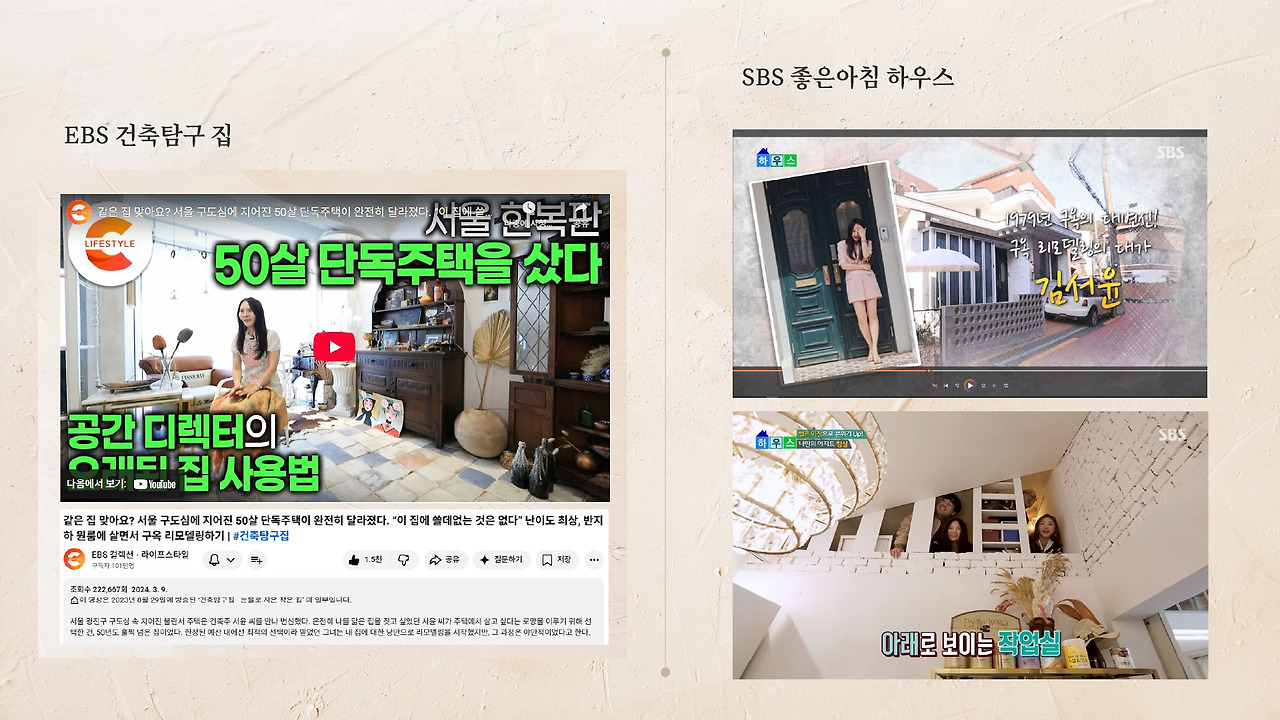 EBS <건축탐구 집>을 비롯한 공신력 있는 미디어의 조명과 단행본 <오래된 집의 탐미>에 아카이빙된 서사는 이그조띠끄의 가치를 객관적으로 입증합니다. 이미 축적된 인지도와 감도 높은 안목은 새로운 소유자가 처음부터 쌓지 않아도 되는 ‘문화적 프리미엄’이며, 별도의 설명 없이도 거주자의 취향을 증명해 줄 지적인 자산이 됩니다.