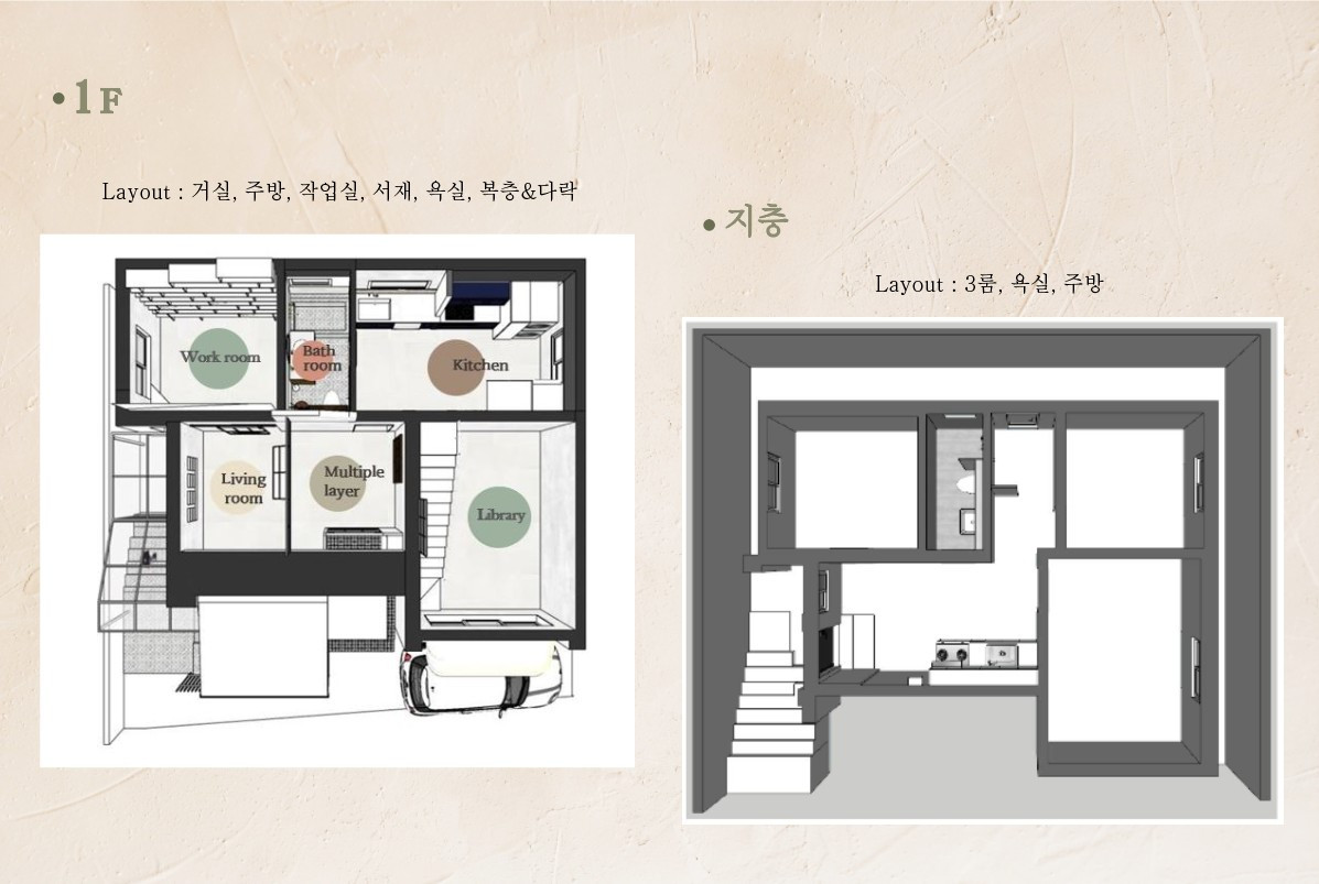 지상과 지층, 두 개의 독립된 세계가 하나의 집 안에 공존합니다. 각자의 동선을 가진 두 공간은 서로를 침범하지 않으면서도, 삶의 서로 다른 층위를 동시에 살아갈 수 있게 해줘요.