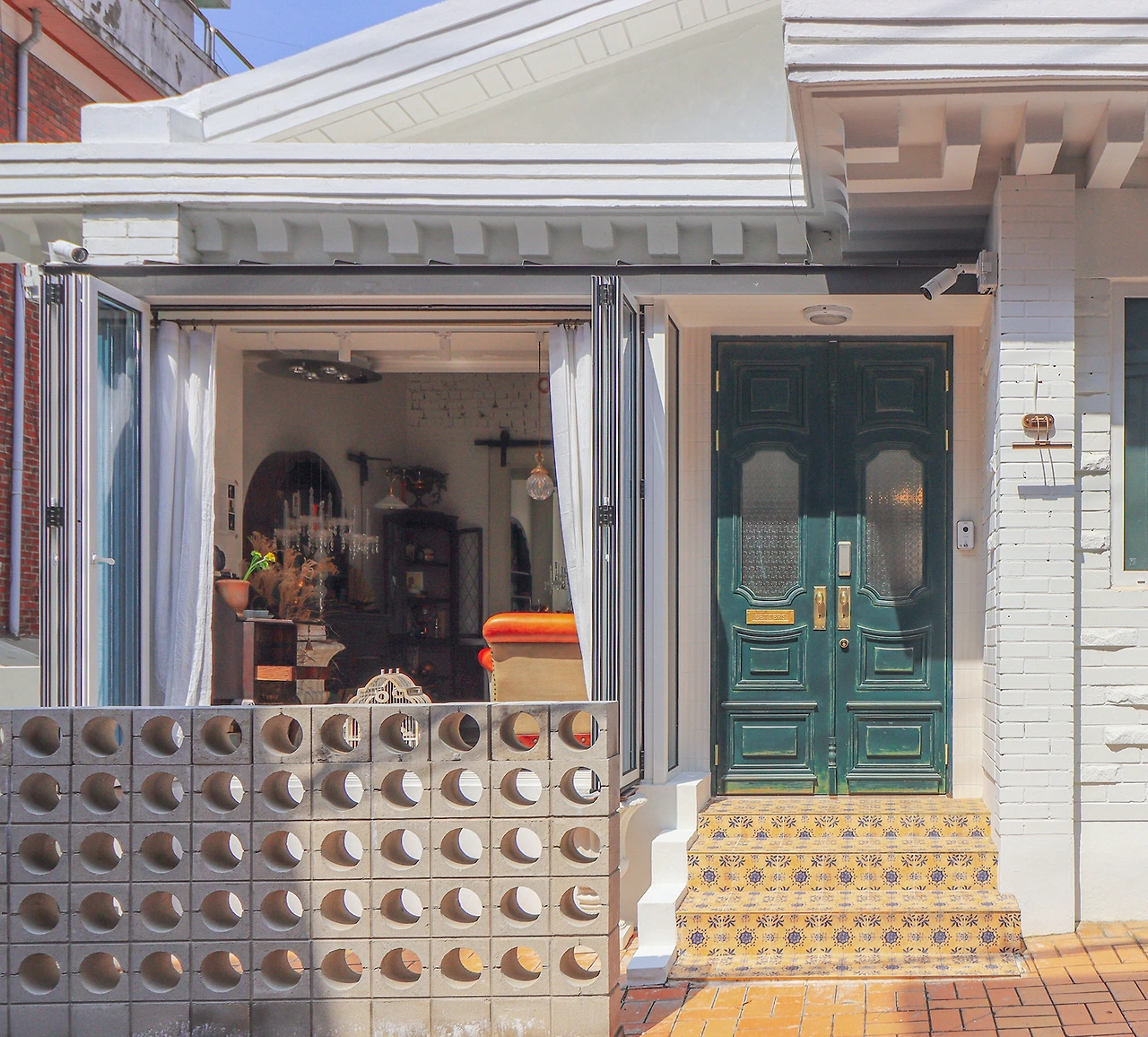 지중해 뉘앙스의 빛바랜 청록색 양개 도어를 열고 들어서면