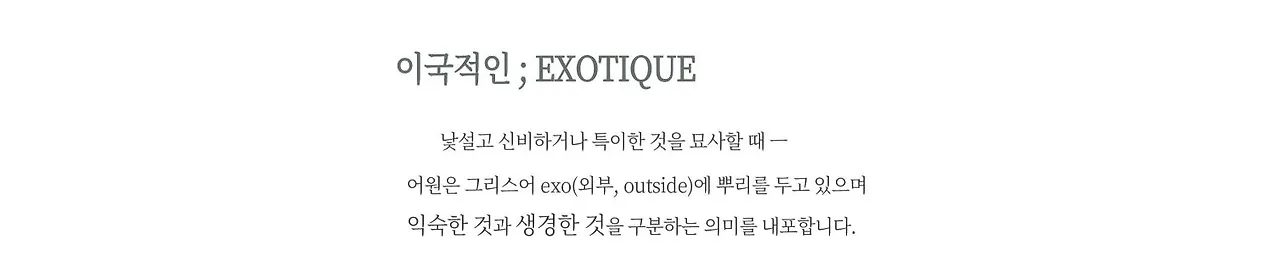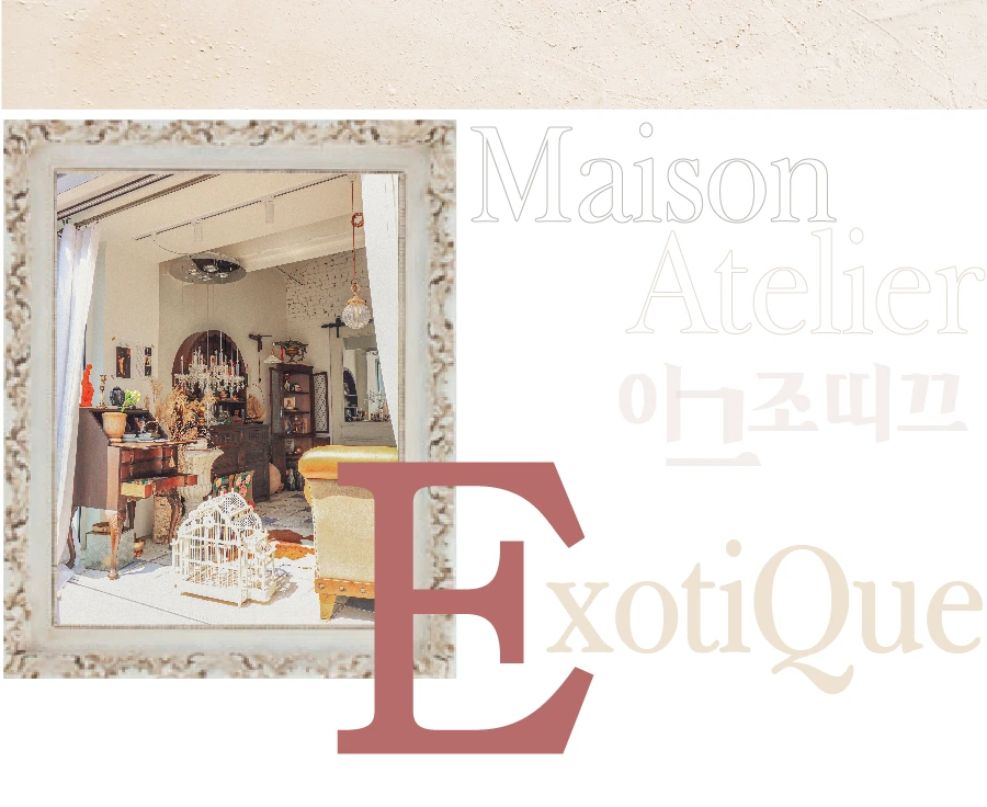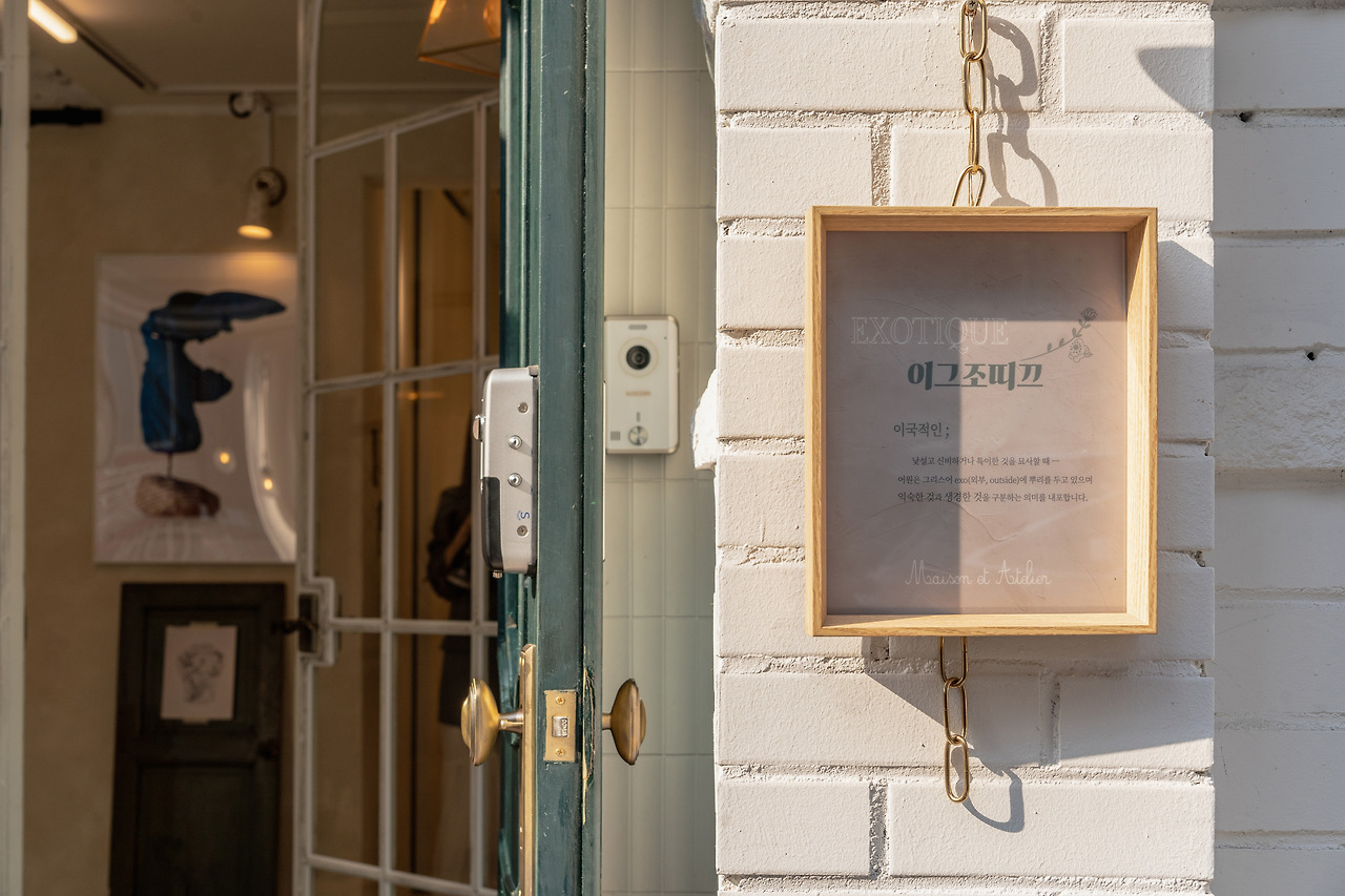 우리에게 익숙했던 일상을 벗어나 생경한 비일상적 공간으로 마치 먼 여행을 떠나 온 것처럼, 이그조띠끄로 영감의 여행오세요. 이 공간에 어울리는 향을 사르고 음악을 틀고 책을 펼쳐내며 고요히 차든 와인 한잔이든 기꺼이 내어 줄 수 있는 예술적 영감과 철학적 공감의 삶을 기대합니다.