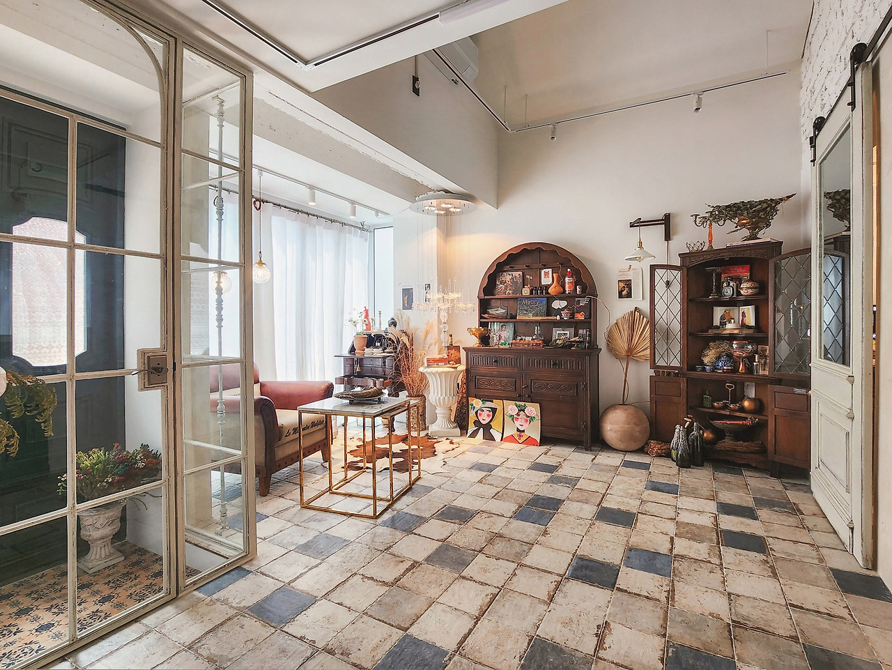 이 공간에 가장 많이 신경 쓴 부분 중 하나가 빈티지한 요소를 극대화할 수 있는 타일입니다. 유약을 입힌 오늘날 형태의 타일은 페르시아 문화권에서 중국 도자기를 모방하는 과정에서 탄생했으며 오스만 제국 시대에 이르러 화려하게 채색한 타일을 보편적으로 쓰기 시작했다고 합니다. 이것이 서유럽으로 역수입되어 스페인, 이탈리아 등지에서 타일을 제조했어요. 그러니 이 인테리어 자제 또한 제가 지향하는 문화적 혼성체와 맞닿아 있는 거죠. 우리나라에서는 타일을 건축 자재로만 인식하는 경향이 강한데 다른 어떤 요소보다 예술적 오브제가 될 수 있는 미학적 가치를 지녔습니다.