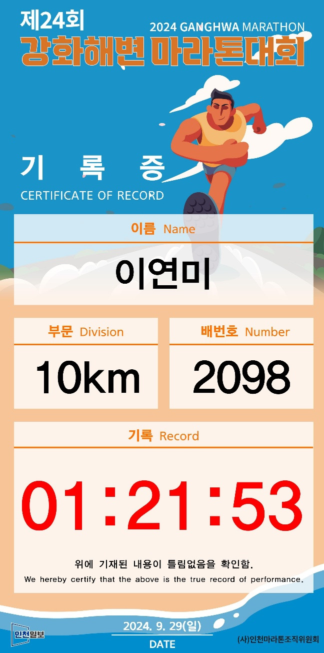 이런 이유로 우리는 접수의 문턱이 낮은 지방 마라톤 대회를 공략하기로 했다. 이번엔 '2024년 강화해변 마라톤 대회'. 강화도라 서울에서 그렇게 멀지 않아서 좋은데다 해변 도로를 달린다고 하니 풍경도 아름답지 않을까 싶었다. 대회도 참가하고 여행 기분도 내고, 겸사겸사 좋았다. 5K, 10K, 하프의 세 가지 코스가 있었고, 우리는 초심(?)으로 돌아가서 10K를 접수했다. (왜 ‘초심’인지는 지난 글의 하프마라톤 체험기를 참고하시길.)