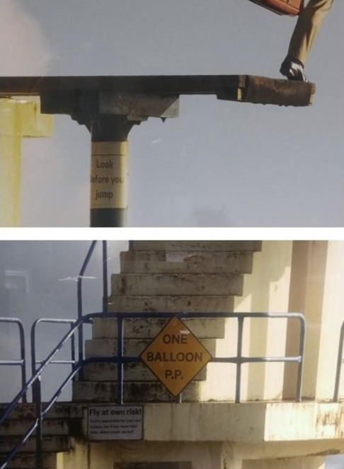 '풍선을 타고 출근을 한다'는 환상을 표현한 작품인 <Leap of Faith(2018)>를 자세히 살펴보면, 점프대 표지판에 ‘One Balloon Per Person’, ‘Look before you jump’라는 재치 넘치는 문구가 적혀있다. 작가가 불가능한 상상을 가능케 하기 위해 얼마나 세심한 부분까지 놓치지 않았는지를 알 수 있다.