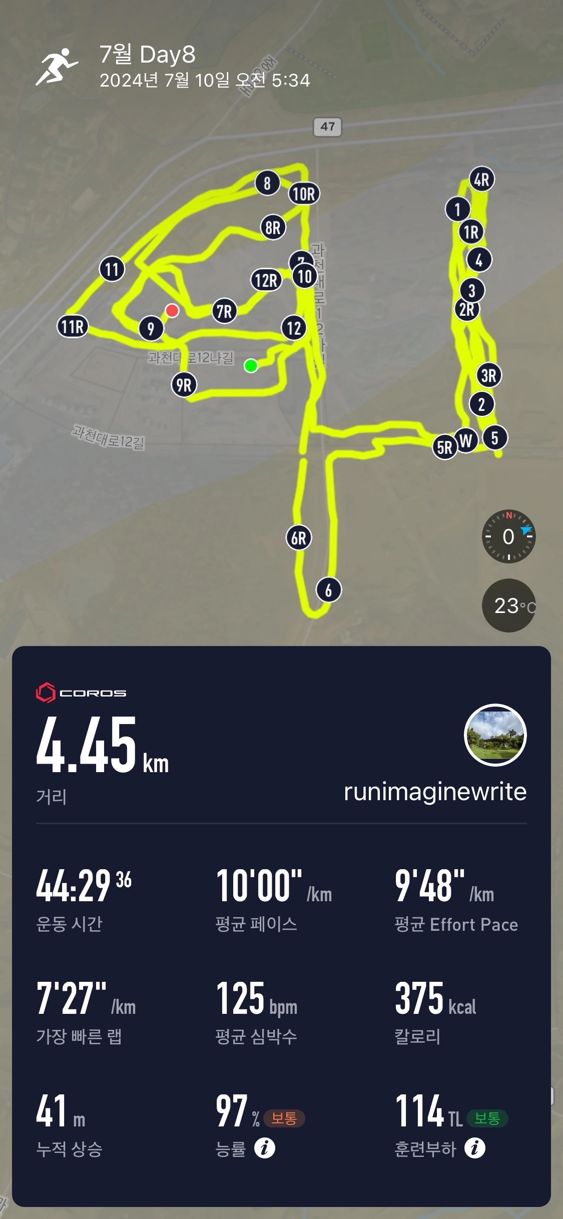 러닝: 웜업-(러닝 2 min+휴식 1 min) ×12회+쿨다운