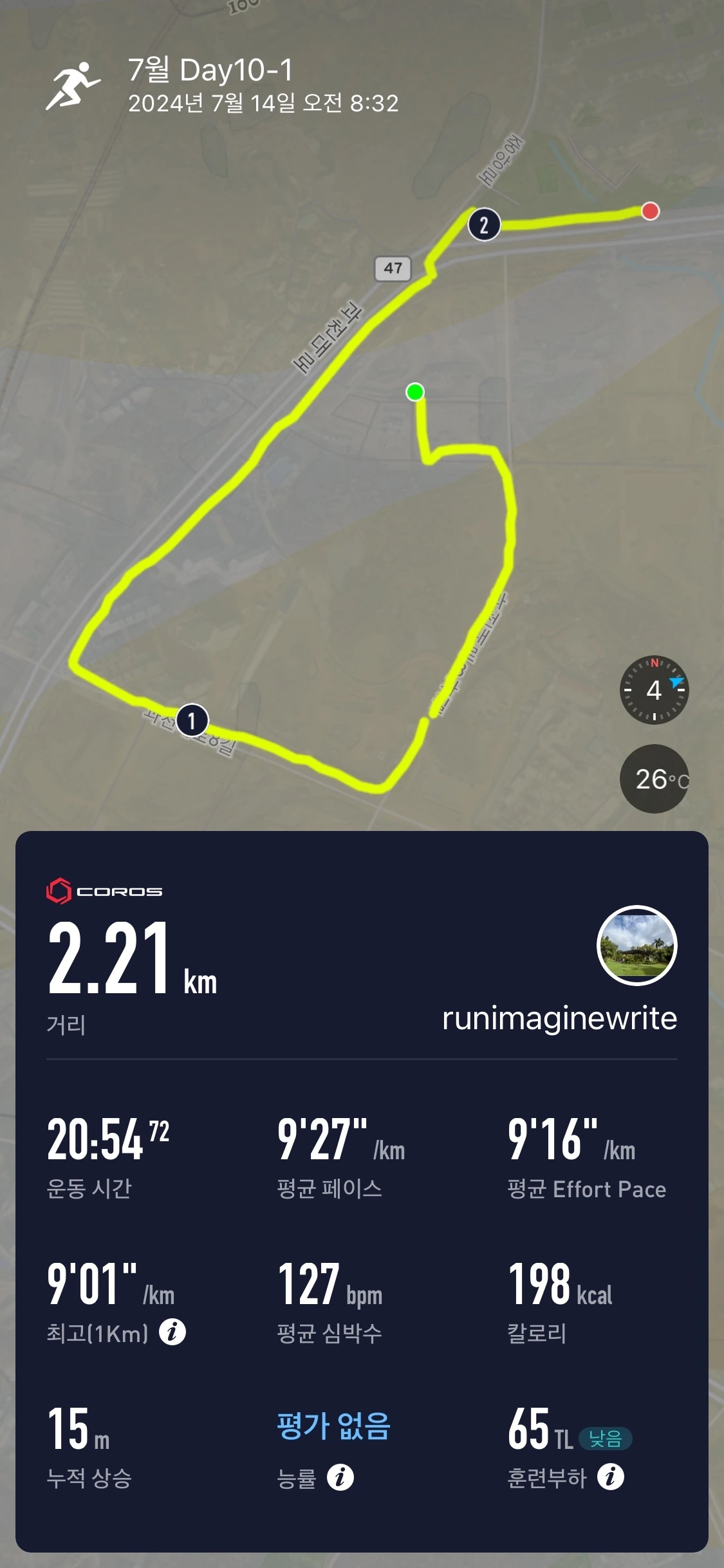 더워진 아침이라 달리러 나가는 것이 힘들었고, 달리는 동안에도 몸이 무거웠던 날이었습니다.