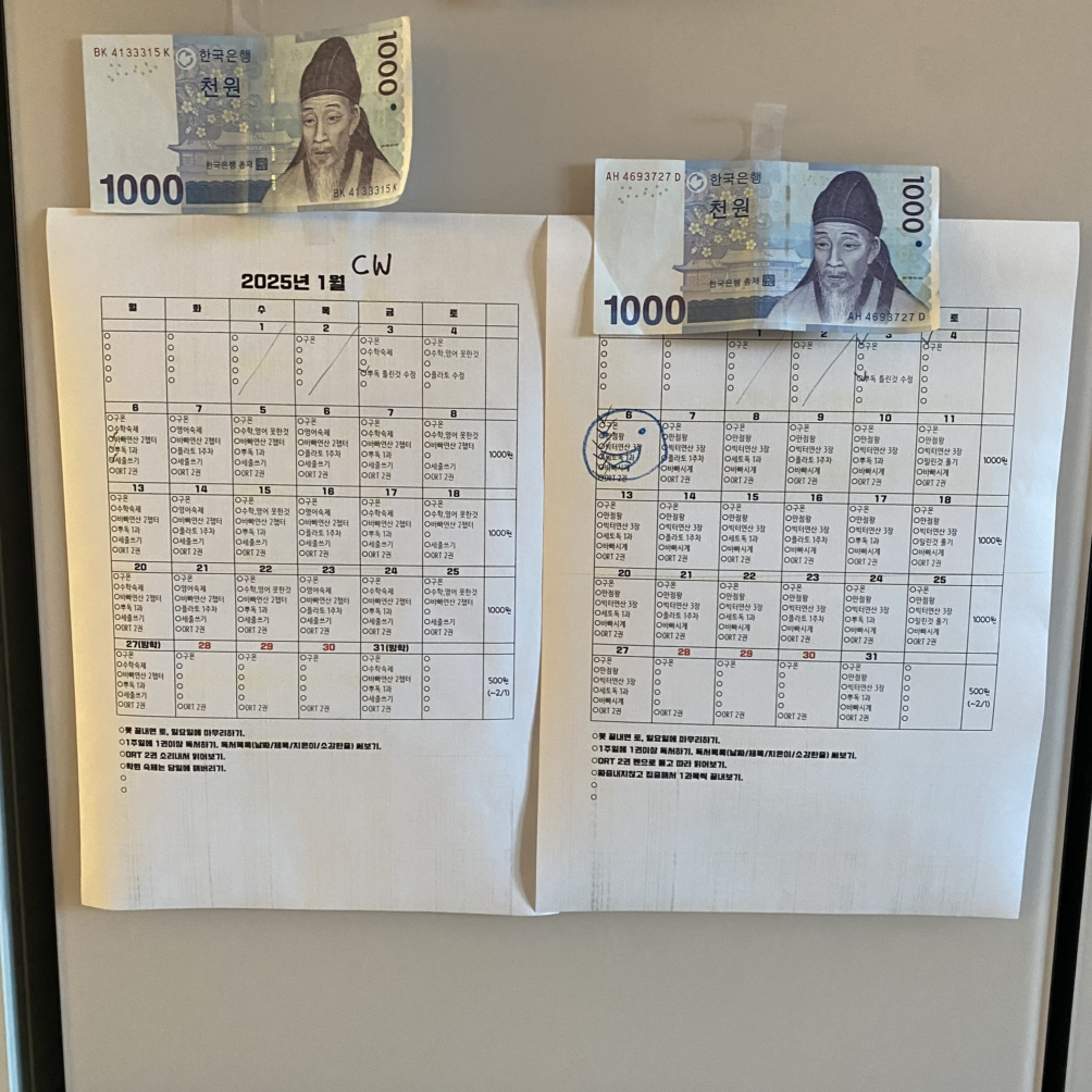 냉장고에 붙여둔 두 아이의 일간 학습리스트