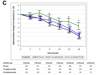 <그림1. 바이오젠/에자이의 레카네맙의 임상 2상 데이터의 일부. 수치가 아래로 내려갈수록 인지 저하가 되었음을 의미한다. 대조군 대비 용량 의존적으로 인지 저하를 막을 수 있음을 알 수있다. 별표는 통계적 유의성을 확보했다는 뜻이다.>